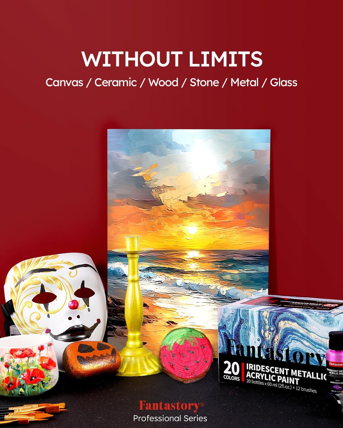 Fantastory Metallic Iridescent Acrylic Paint Set with 12 Brushes, 20 x 2oz Metallic Colors, Color-Shifting, Craft Paint Kit, Metal/Canvas/Rock/Stone/Ceramic/Model/Wood Painting [Professional Series]