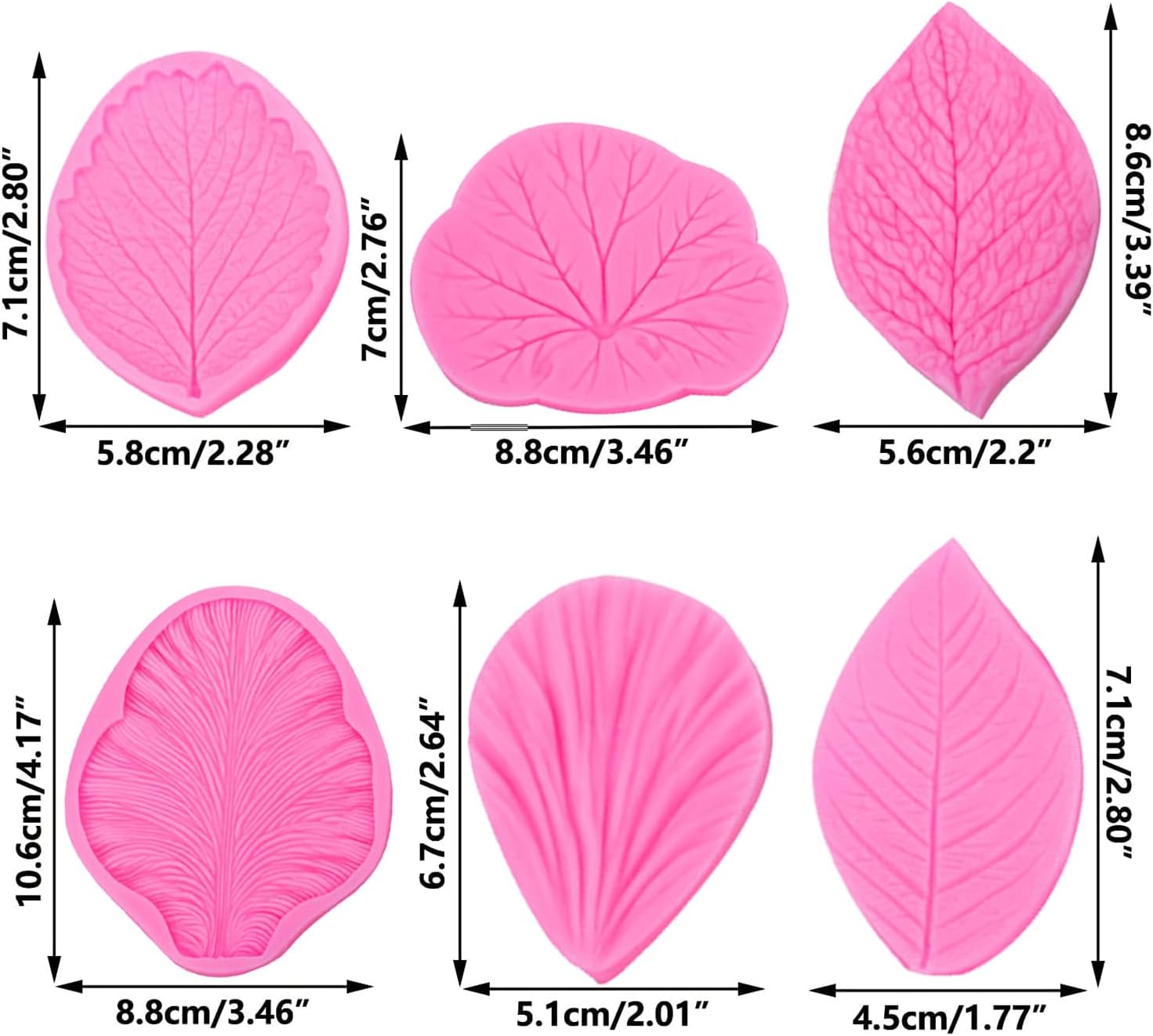 - You will get 8 set Flower Petals Silicone Molds: Lily Silicone Molds, Hibisus Silicone Molds, Rose Leaf Silicone Molds, Rose Flower Silicone Molds, Anemone Silicone Molds, Tulips Silicone Molds, Orchid Silicone Molds. The size of each mold is different, Please refer to the picture for the specific size.
