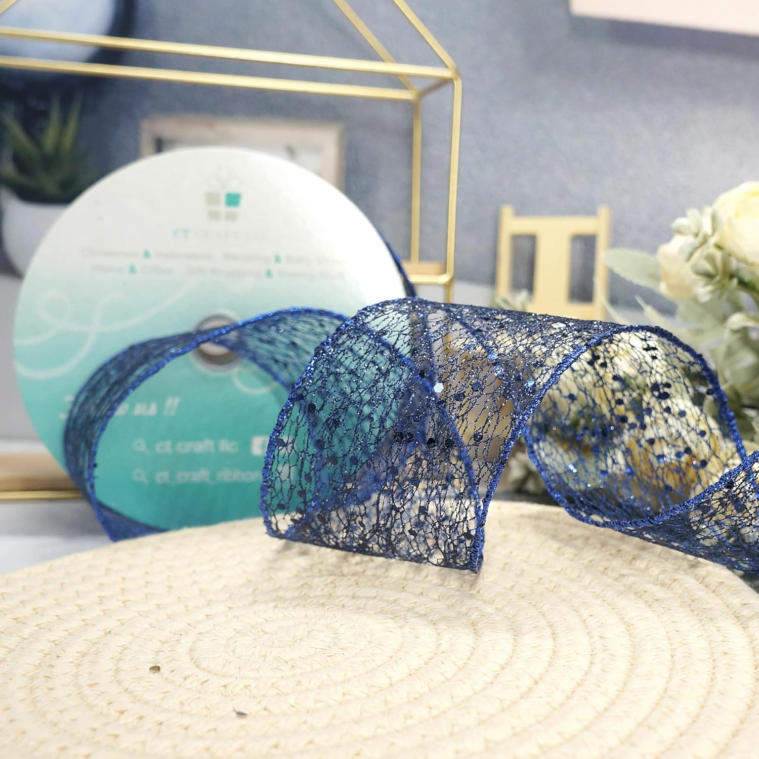 CT CRAFT LLC Sparkling Glitter Mesh Wired Ribbon 2.5" x 20 Yards Blue Navy for Christmas Home Decor Bow Gift Wrapping DIY Crafts Wreath