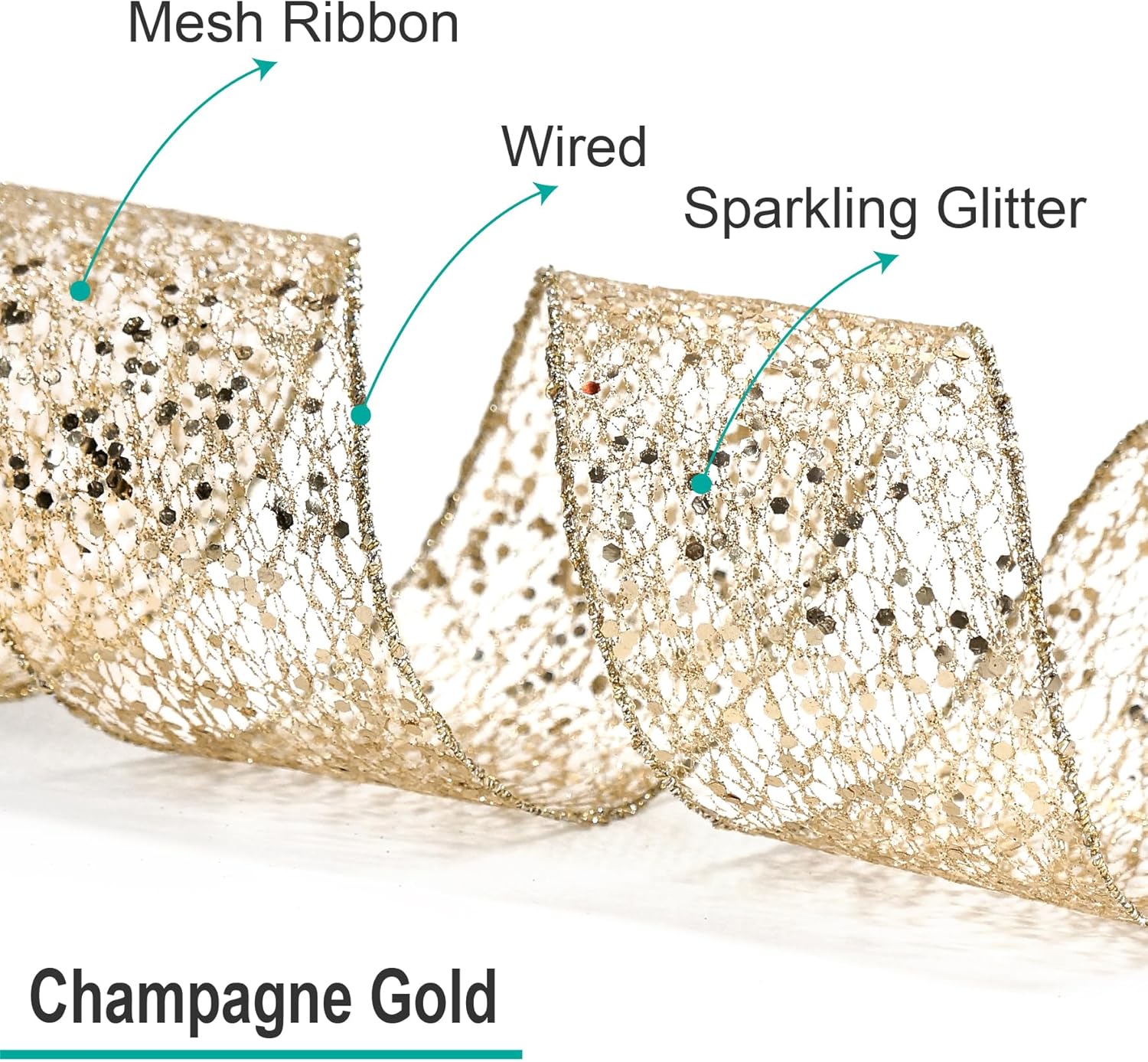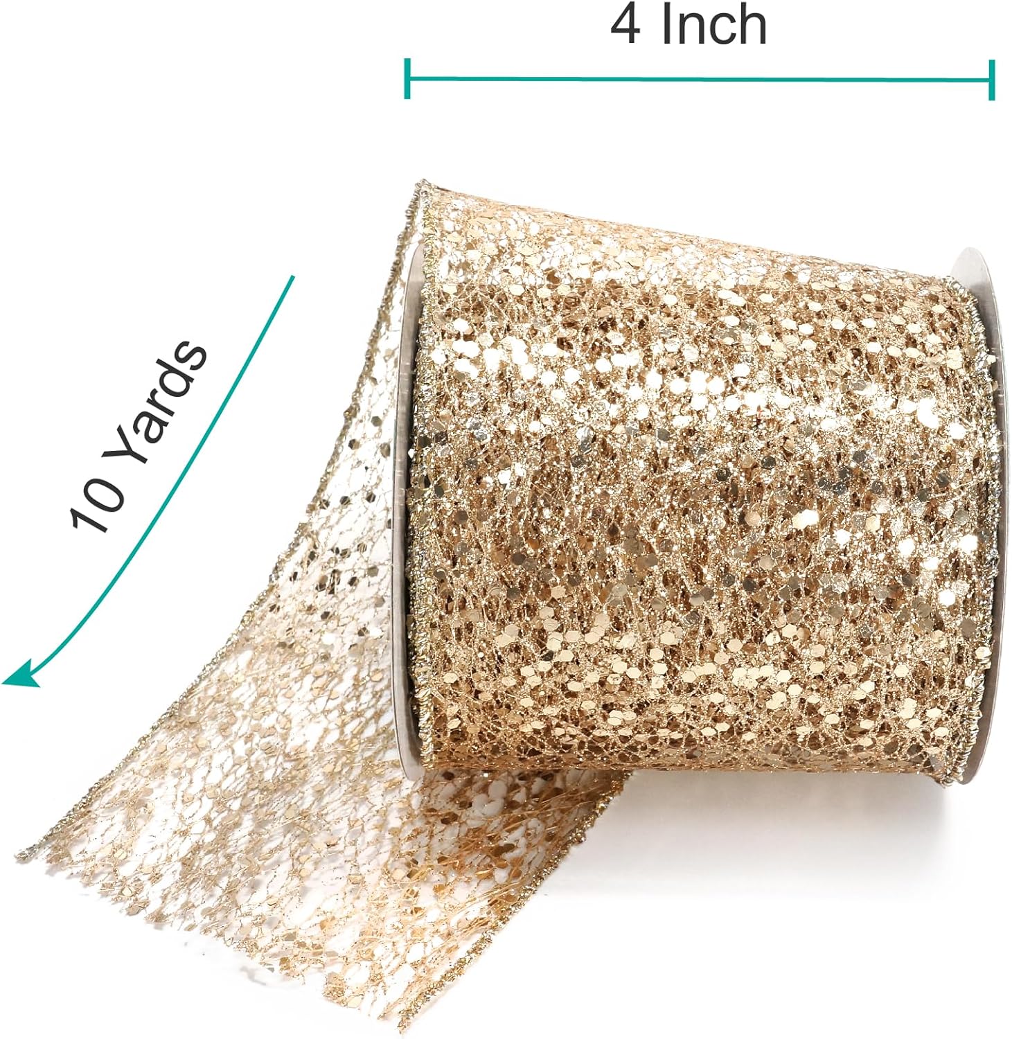 - A MUST-HAVE FOR DECORATION - Don't miss it if you're choosing a Sparkling Glitter Mesh Wired Ribbon 4" Champagne Gold for your decoration! Our ribbon works perfectly for decorating and adding finishing touch to your craft projects. Simple and elegant.