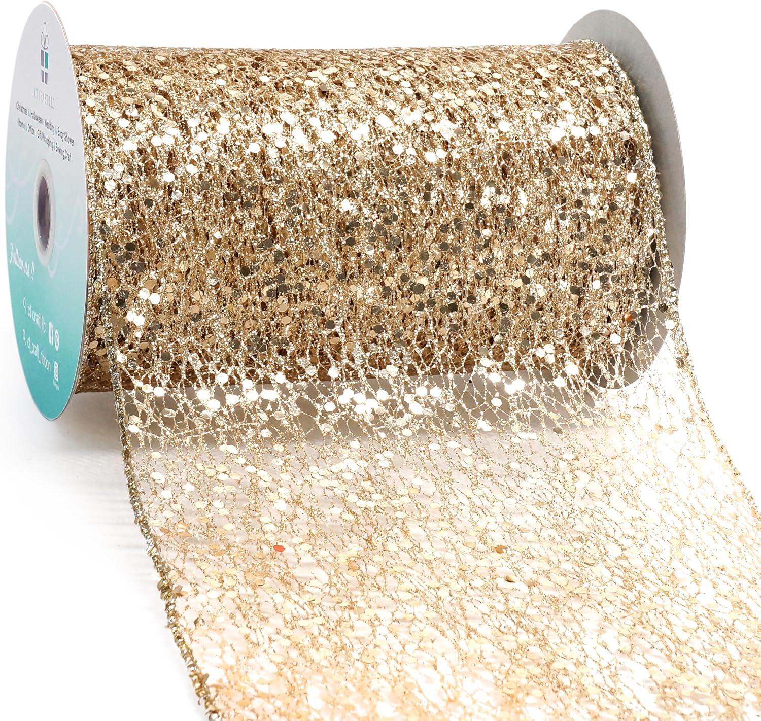 - GREAT WORKMANSHIP - Our Sparkling Glitter Mesh Wired Ribbon 6" has a density weave so you won’t find any loose edges. You won’t find any fraying ends or loose strings anywhere, making our Sparkling Glitter Mesh Wired Ribbon 6" Champagne Gold color perfect for high-end and professional DIY works and Crafts.