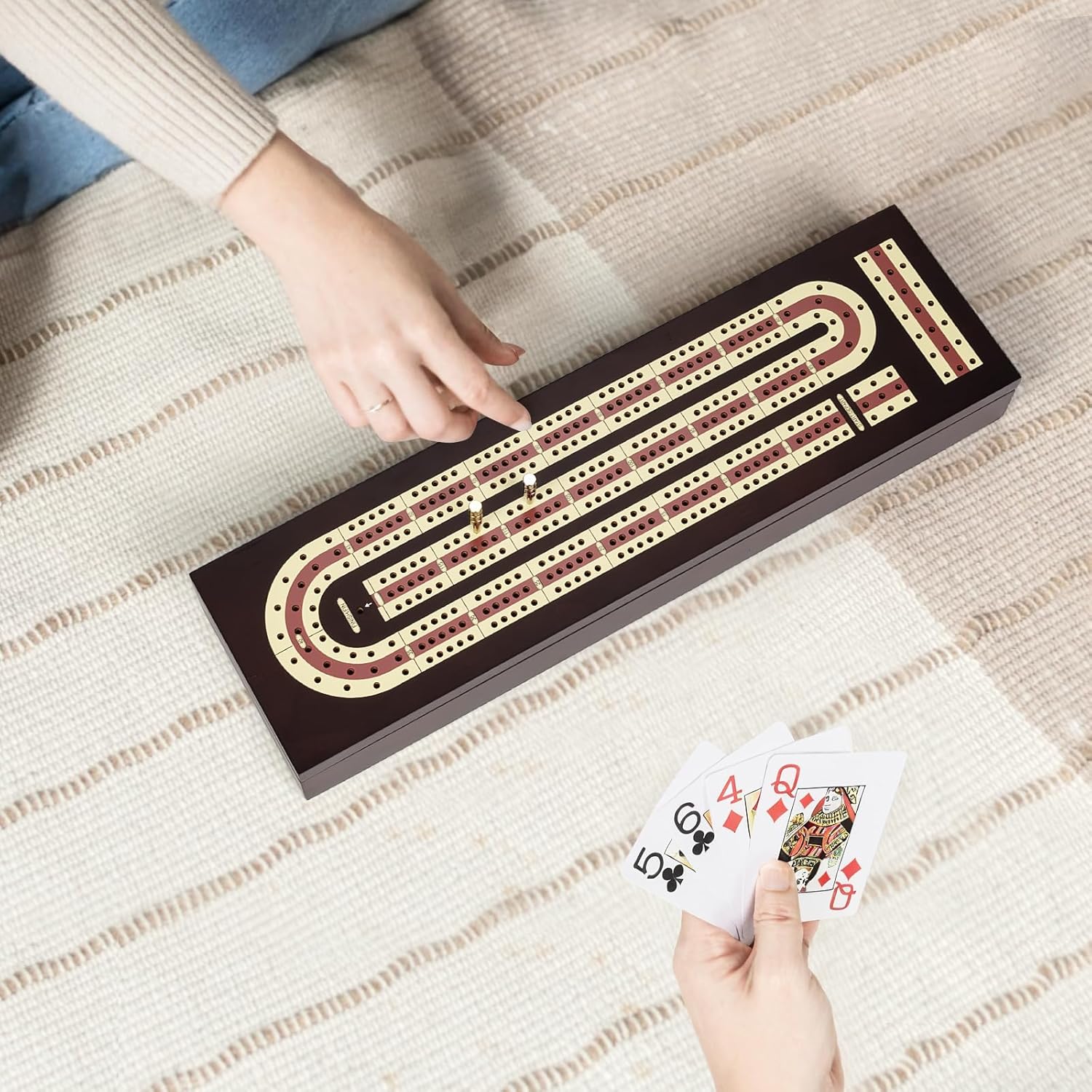 Cribbage Board Game Set, Premium Wooden Board with Magnetic Lock and Metal Pegs, 2 Playing Cards, and Large Storage - Travel-Friendly Continuous 3 Track Board
