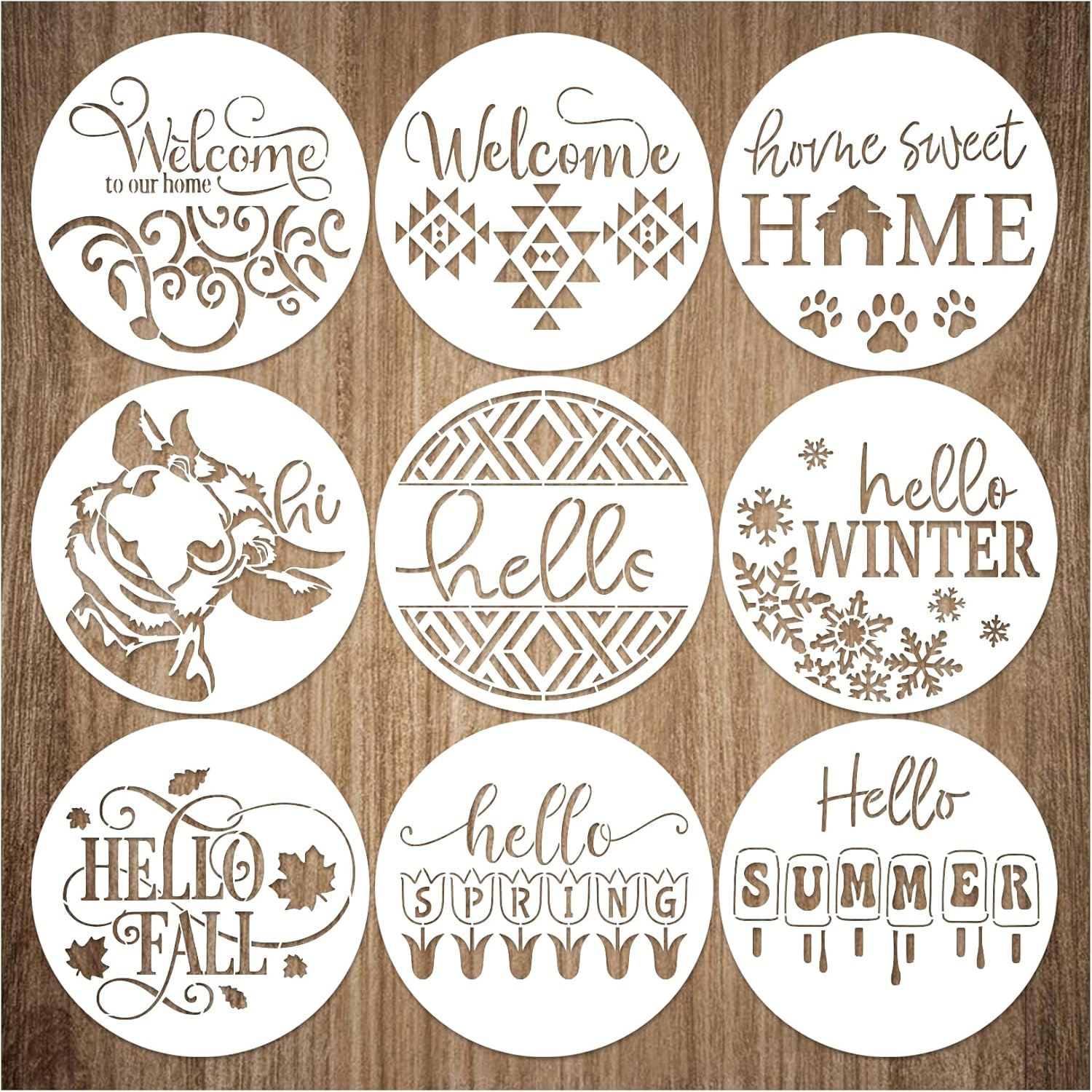 9 Pcs Welcome Stencils for Painting on Wood Reusable Round Home Sweet Home Stencil Large Hello Fall Templates for Door Hanger Canvas DIY Crafts (9 Welcome)
