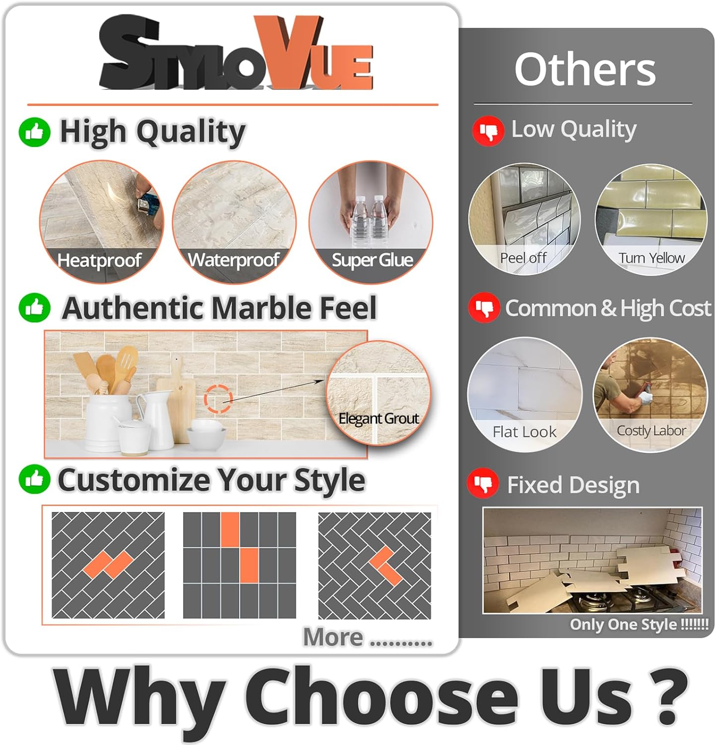 - ๐๐ฅ๐๐ฏ๐๐ญ๐ ๐๐จ๐ฎ๐ซ ๐๐ฉ๐๐๐: Featuring unique slot edges for a realistic grout-look, StyloVue self adhesive wall tiles offer an authentic design and texture that customers adore. Elevate the aesthetic of your space while simplifying maintenance and cleaning, without the hassle of traditional grouting.