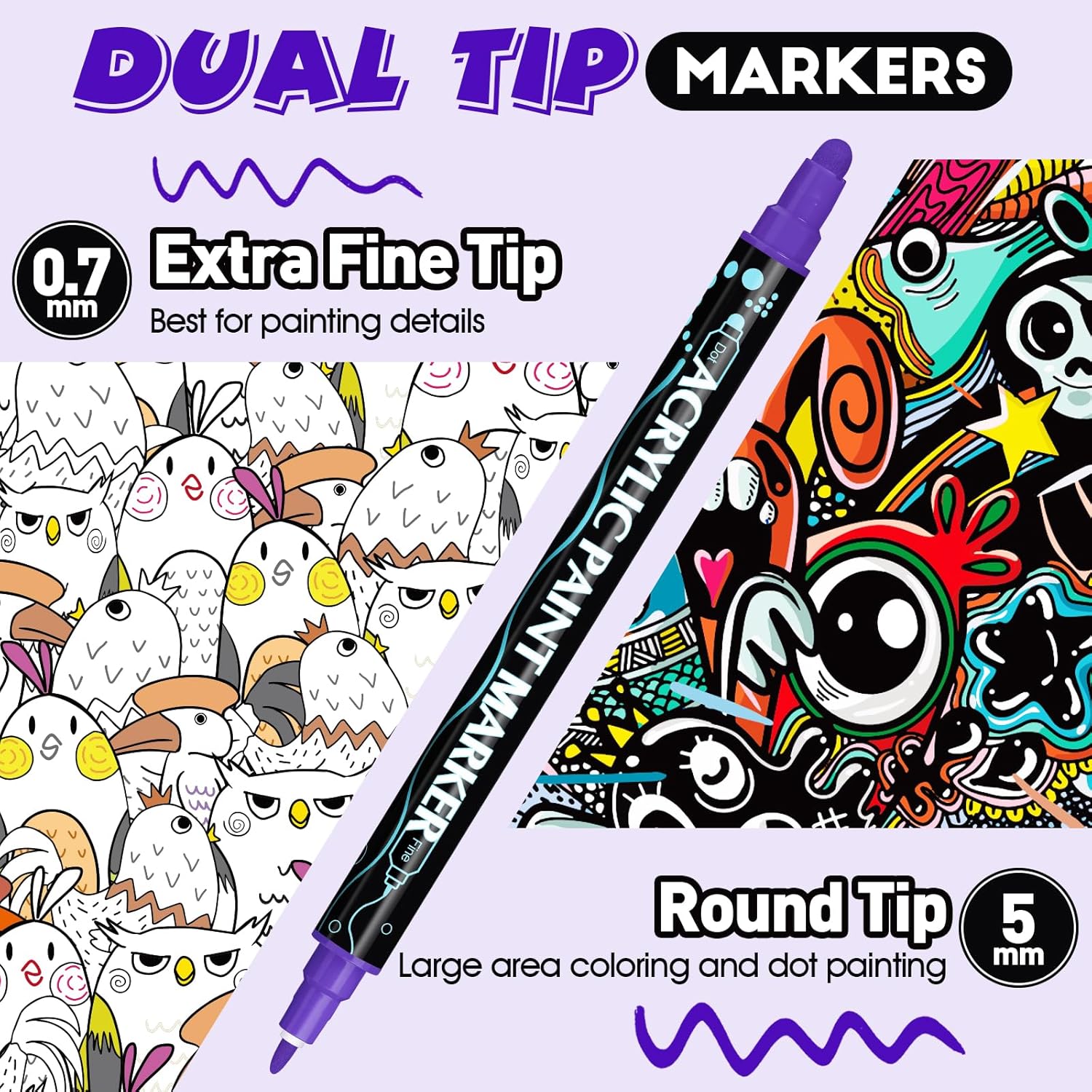 - 【Dual Tip】Each acrylic paint marker come with a 0.7mm extra fine tip and 5mm dot tip,Dual tip acrylic paint pens meet different design requirements.Fine nibs are more suitable for handling details.Such as outlining, fine line work.The dot tip is more suitable for large-scale painting and coloring.