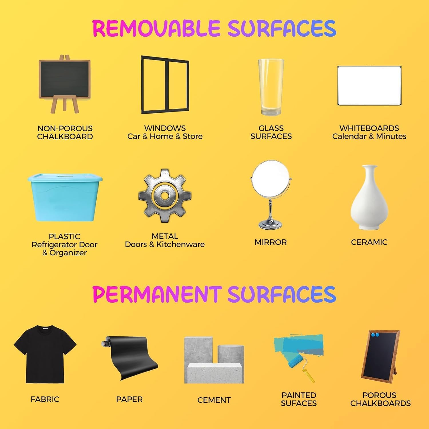 - 【Every Corner of Life, Endless Possibilities】SFAIH Liquid chalk markers writes on any smooth, non-porous surface. Classroom notes on blackboards; meeting points on whiteboards; family calendars; fridge meal plans; glass window party doodles; kids' art easels; pantry jar labels. From blackboard to sports cars, family calendars to glass windows, SFAIH Chalkboard markers transforms the world into your canvas.