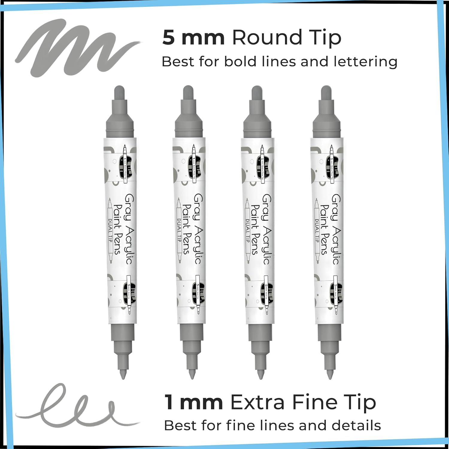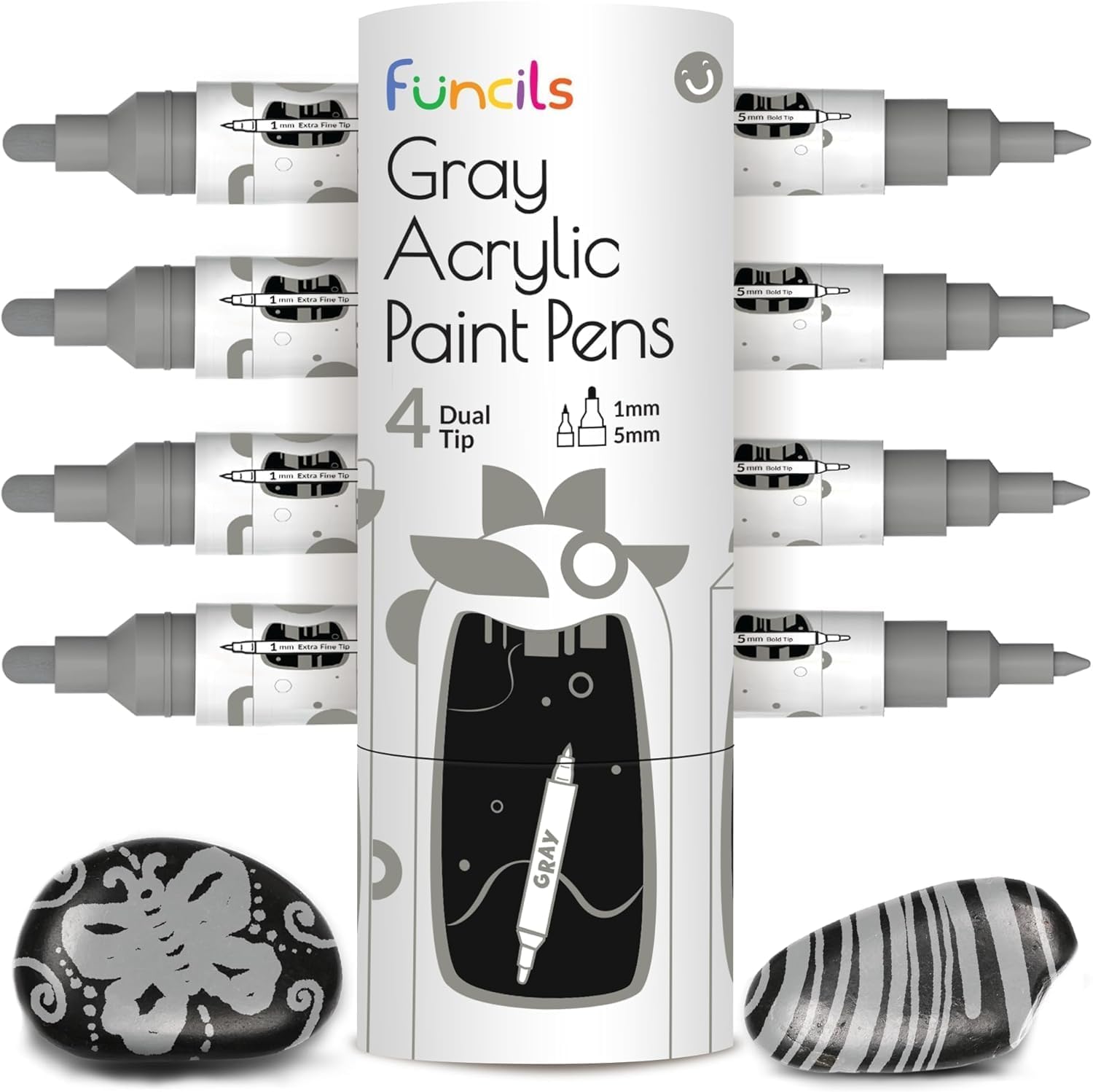4 Dual Tip Gray Paint Pen Metallic - Fine Tip & Medium Acrylic Paint Markers - Gray Marker for Metal, Wood, Rock Painting, Canvas, Ceramic, Glass, Fabric, Leaf and Plastic - Water-based Ink