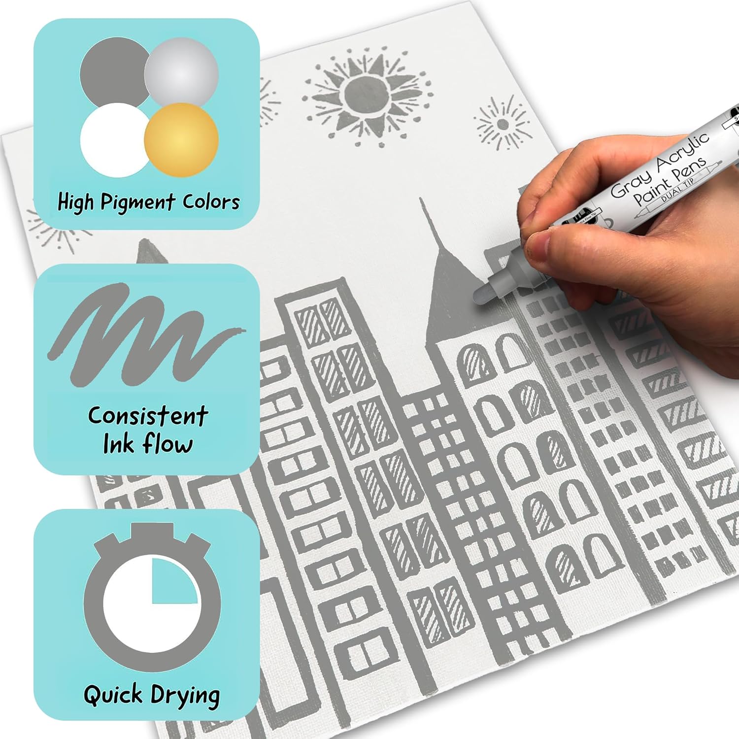 - Gray Paint Pens Metallic - Highly pigmented, Quick to dry & used as paint markers for canvas, paint markers for wood, or as glass paint markers, rock painting pens, on wine glasses & ceramic paint pen (dishwasher safe ink)