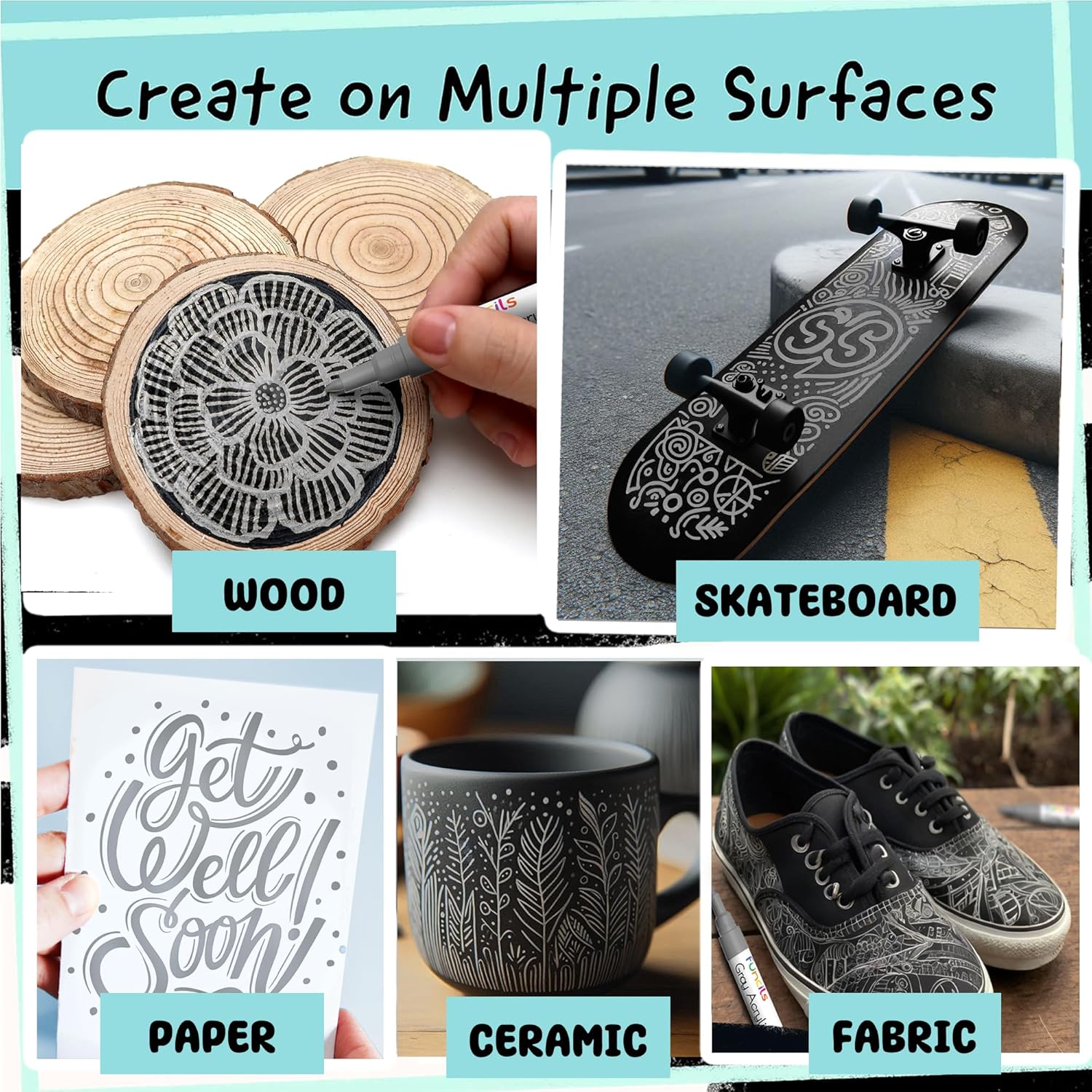 - Multiple Use Acrylic Markers - Get creative with DIY crafts using these paint marker for canvas, fabric paint pen, metal, porcelain, plastic, stones, polymer clay, wood, as acrylic paint pens for rocks painting, paint marker for metal