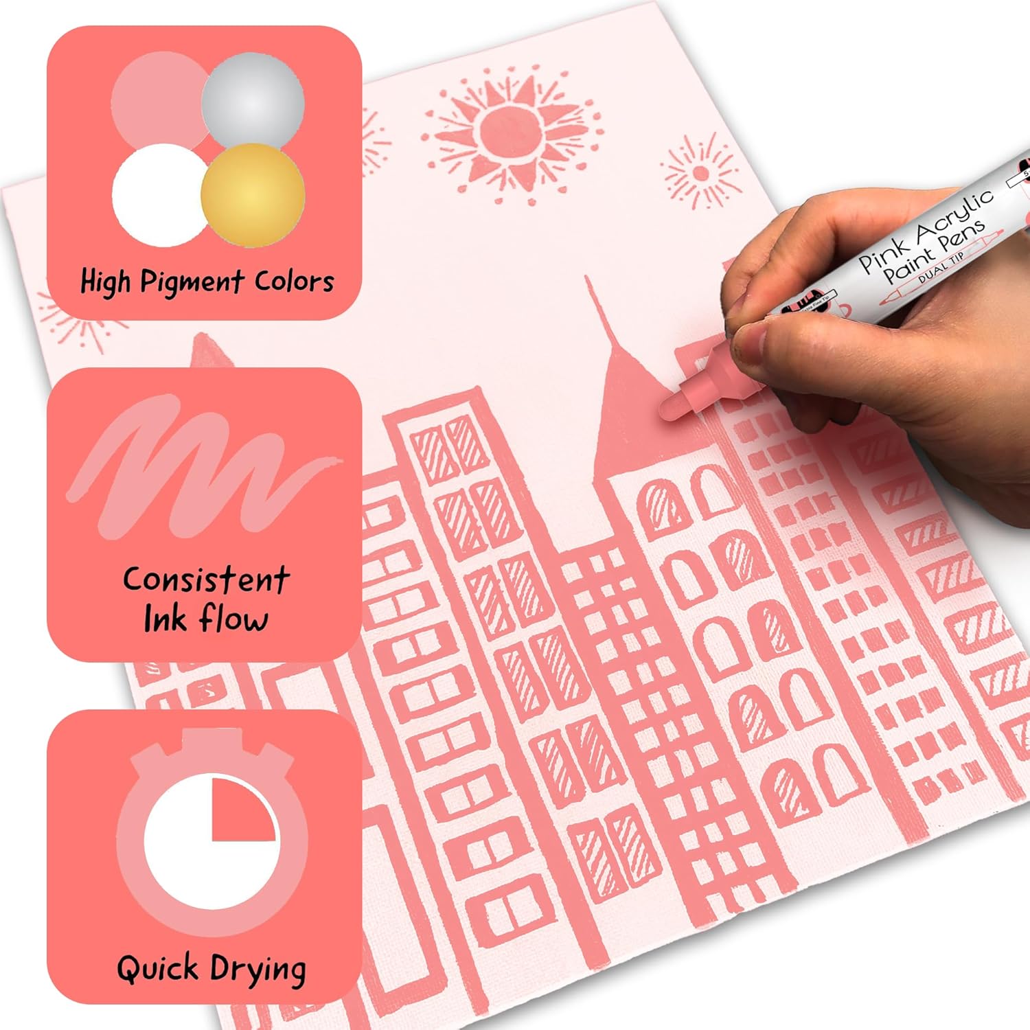4 Dual Tip Pink Paint Pen Metallic - Fine Tip & Medium Acrylic Paint Markers - Pink Marker for Metal, Wood, Rock Painting, Canvas, Ceramic, Glass, Fabric, Leaf and Plastic - Water-based Ink