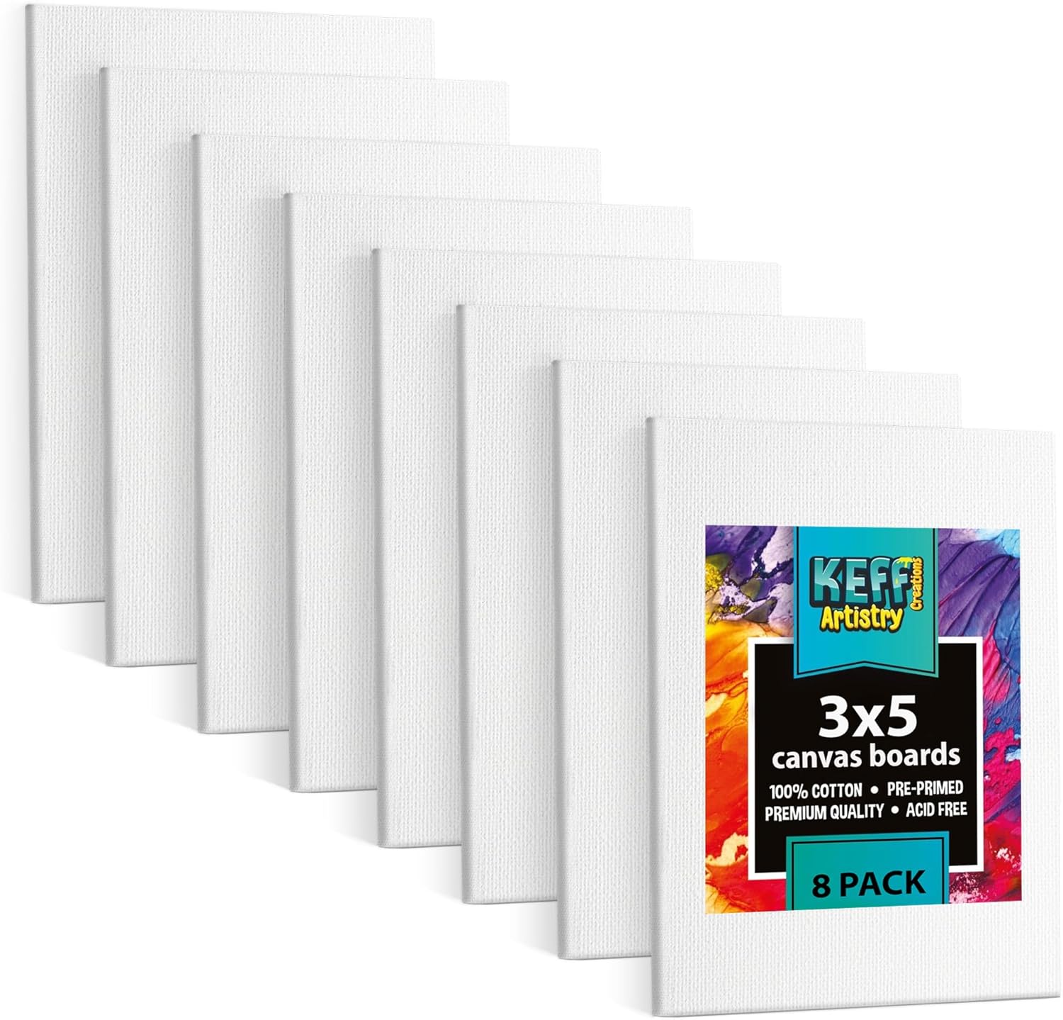 KEFF Canvas Boards for Painting - 3x5 8-Pack Bulk Canvas Pack, 100% Cotton Triple Primed Small Canvases for Painting Supplies, Acrylic, Oil, Watercolor & Tempera