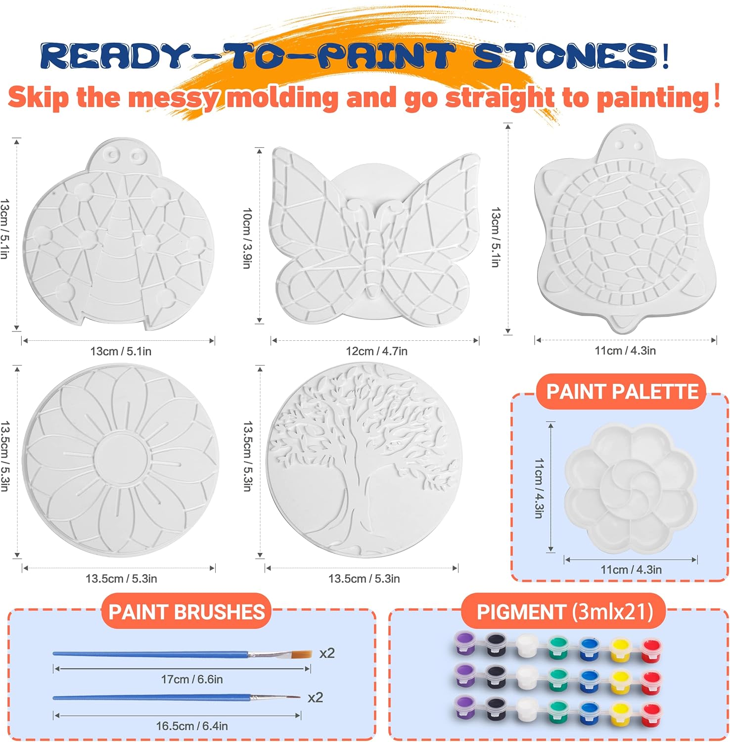 - Ready-to-Paint Garden Stone:Skip the messy molding and jump into a world of creative fun as you paint your own stepping stones.Diy arts and crafts kits comes with 5 pack stepping stones of different shapes(Flower;Butterfl;Turtle;Tree;Ladybug),3 sets of paints strips;1 mixing color pads; 4 paintbrushes