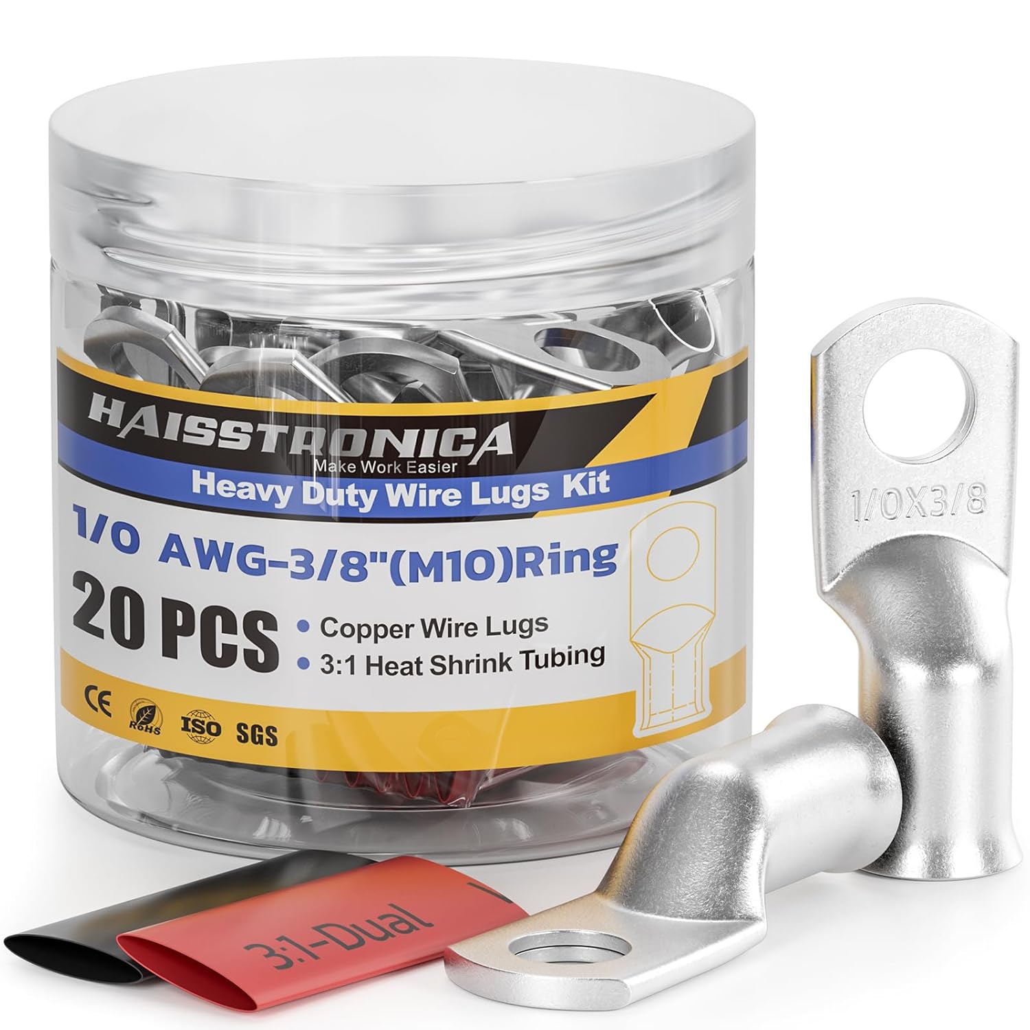 - Tinned Copper Lugs and Heat Shrink Tubing Kit: 10 PCS 1/0 gauge (AWG) -3/8"(M10) ring terminals tinned copper wire lugs and 10 PCS 3:1 Dual Wall Adhesive Heat Shrink Tubing(5 black and 5 red), and comes with a sturdy clear plastic jar that make battery cable ends easy storage