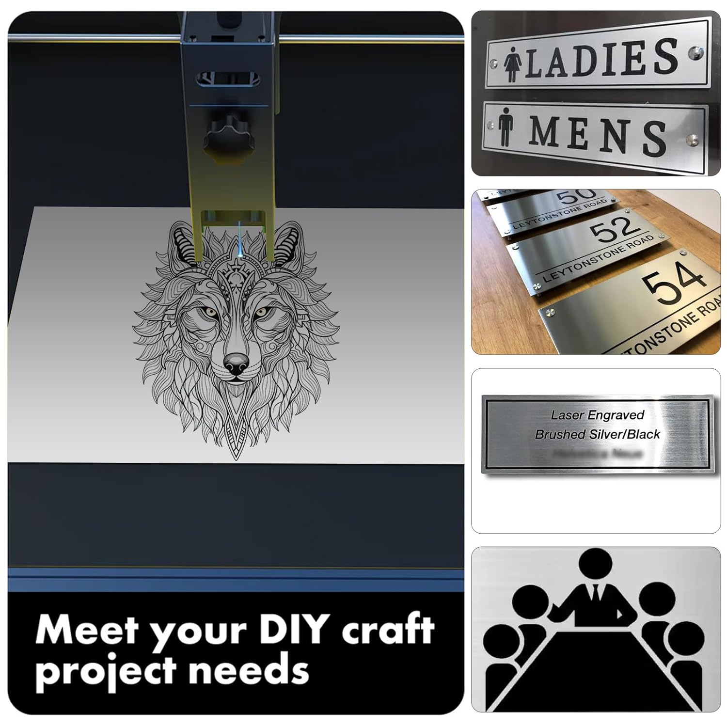 - Brushed Silver/Black Two-Tone Engraving Sheet---Designed for laser engraving, the double-layer acrylic material allows for fast, cost-effective engraving, resulting in a high-contrast permanent mark.