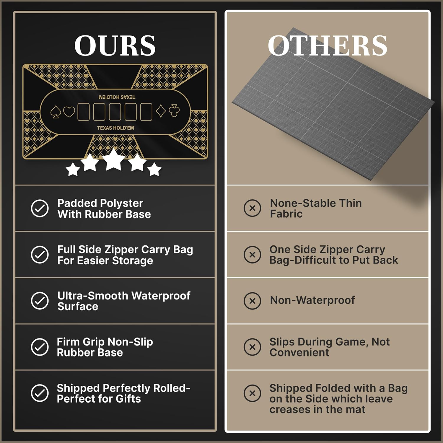 - UNZIP, ROLL & PLAY - Our poker table mat allows for a quick and hassle-free setup. When the game is over, it can be conveniently rolled up and stored in the included carrying case, saving you space and time.