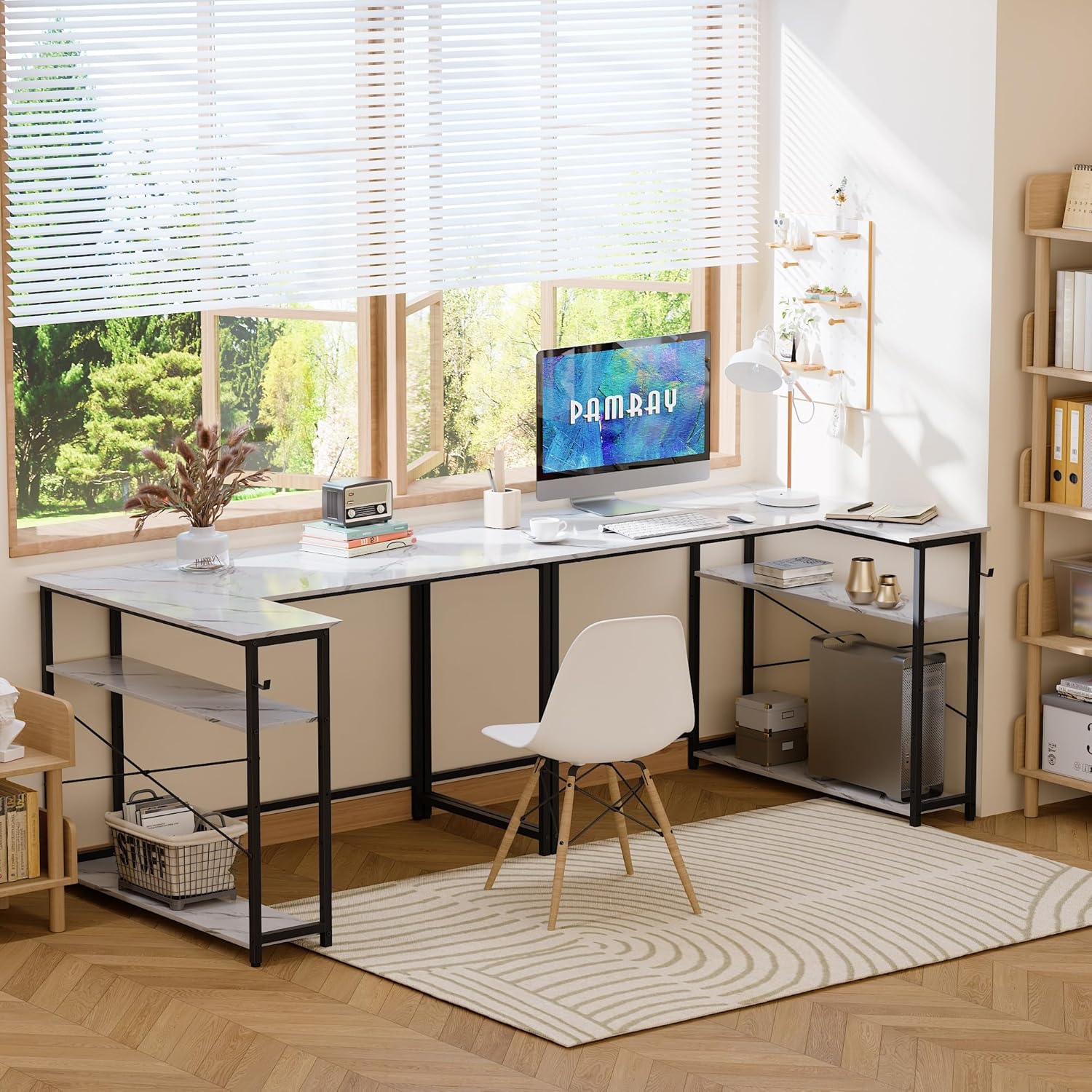 Pamray 43 Inch L Shaped Computer Desk with Reversible Side Storage Shelves, Small Corner Desk for Small Space Home Office,Writing Study Table PC Desk for Bedroom,White Marble