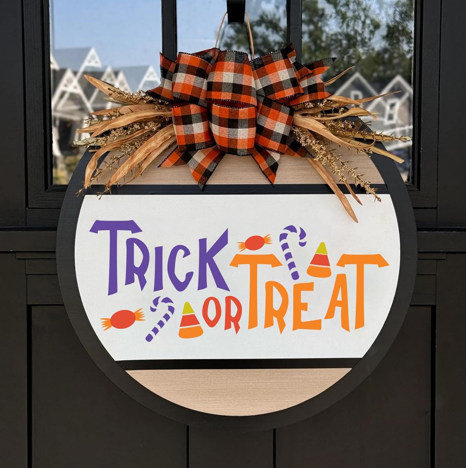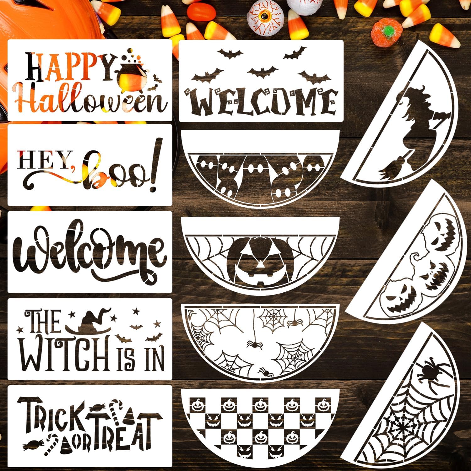 - 12β Halloween Stencils:The Halloween stencil for wood set is a great way to add scary accents to your home decor.Combine the patterned stencil with the Halloween quotes stencil to decorate round wood wreath.Great for indoor use and displayed on a covered front door or porch.