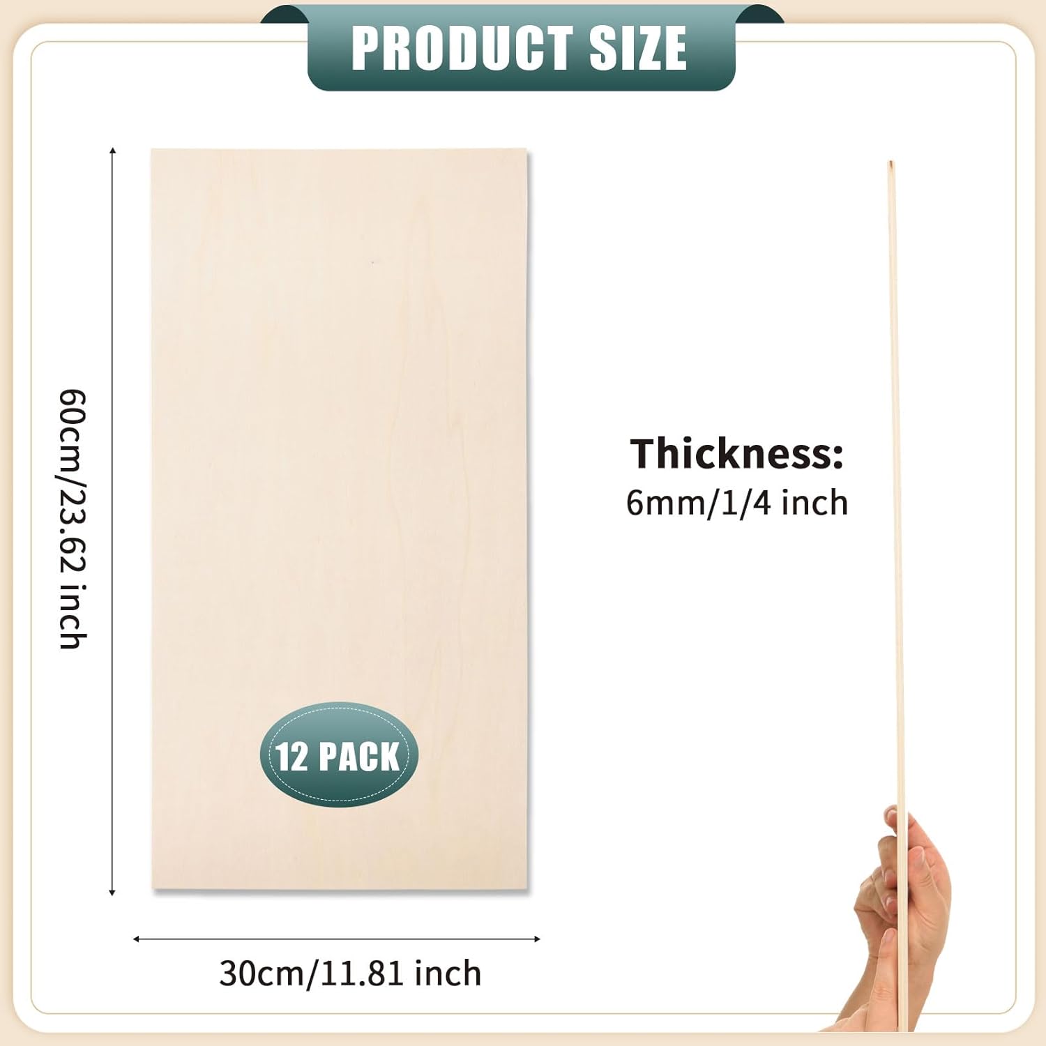 12 Pack 12 x 24 x 1/4 Inch-6mm Thick Basswood Sheets for Crafts Unfinished Plywood Sheets Rectangular Wood Panel Boards for DIY Laser Project, Wood Burning, Engraving, Architectural Models, Staining