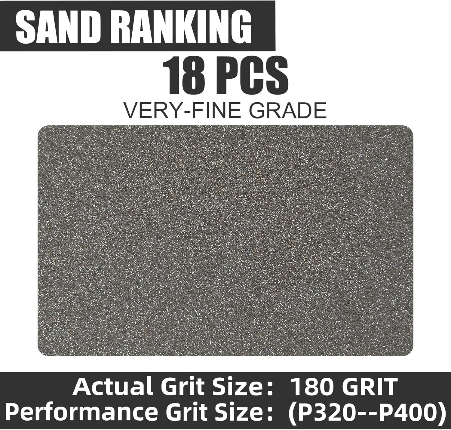 - Package Content: 18 pcs sanding sponges. Each sponge is labeled with a grit number of 180, indicating the printed grit size. However, due to the product's structural design, the actual sanding effect may range from P320 to P400.