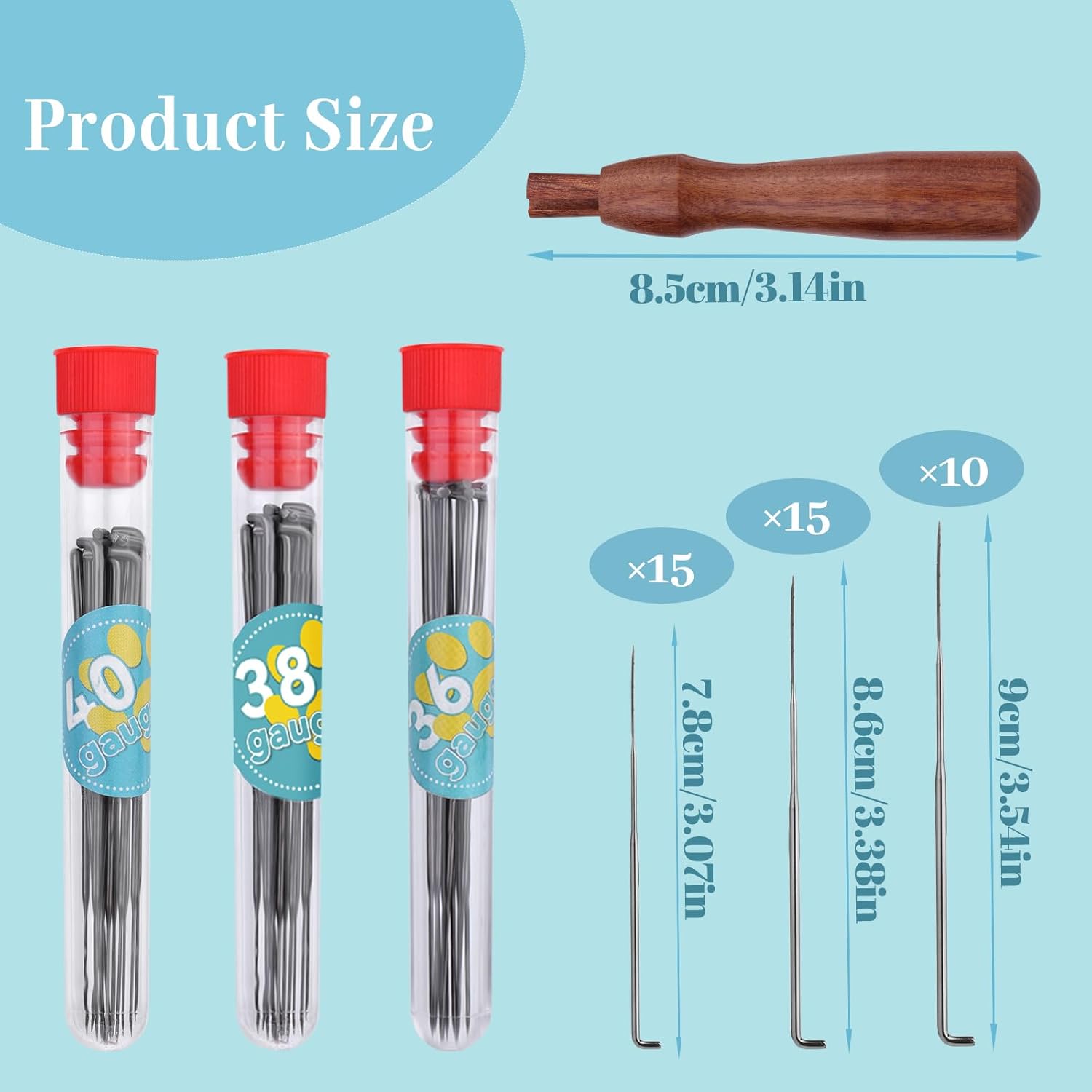 - Felting Needles Set Size: The felting needles set includes 10 pcs thick felting needles, 15 pcs middle felting needles, 15 pcs fine felting needles, 1 pcs wooden handle tool, and 3 pcs white transparent bottles. The thick needles are suitable for the fast felting stage, the middle needles are suitable for the fixed shape stage, and the fine needles are suitable for the fine processing stage.
