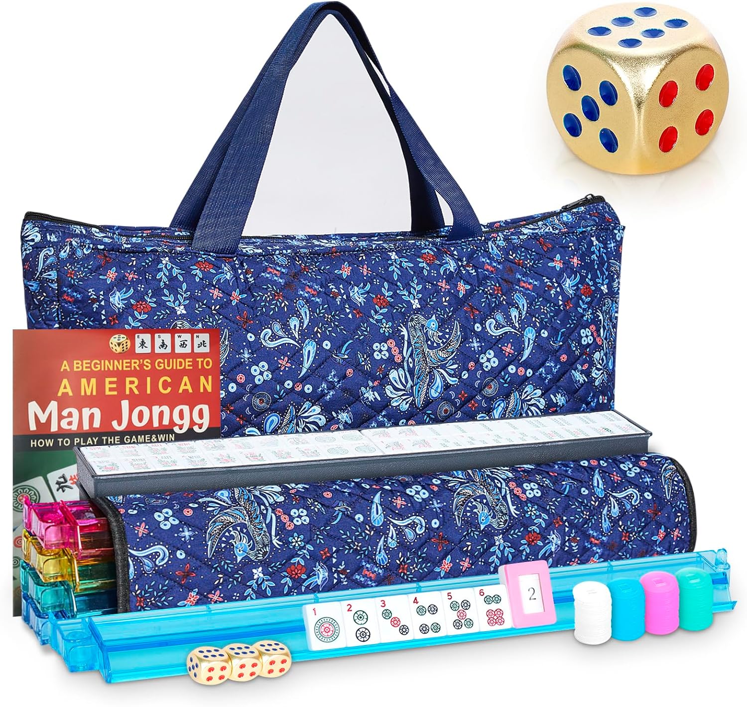 New American Mahjong Game Set, 166 Premium White Tiles with Portable Metal Dices, 4 All-in-One Racks with Pushers, Mah-Jong Games Sets, Ma Jong Tile Game (Blue)
