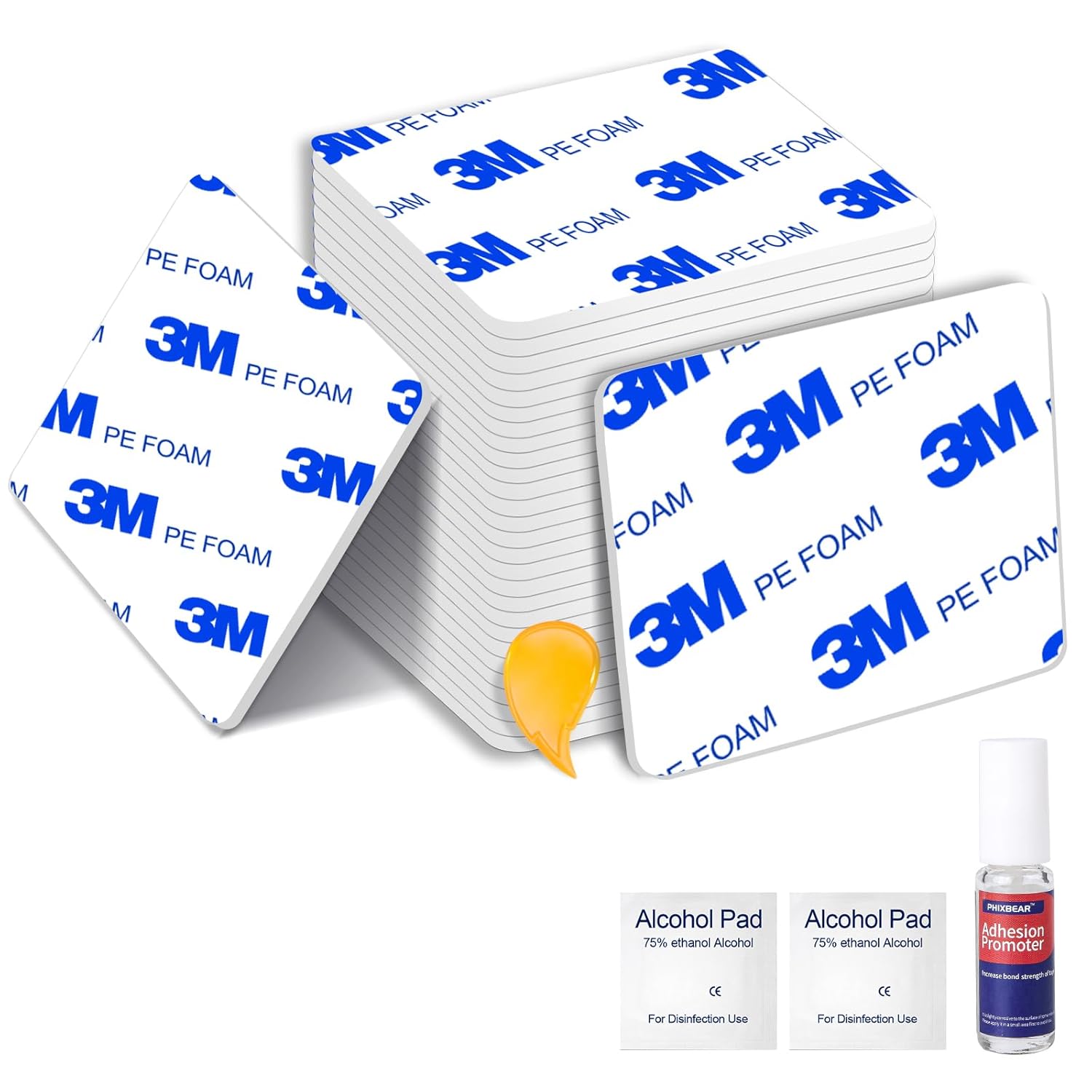- 【Abundant Quantity】Contains 32 pieces Made of 3M PE Strong adhesive double-sided tape, square 1.69x2.15 Inch, to meet your wider use. And a bottle of adhesion promoter and two alcohol pads.