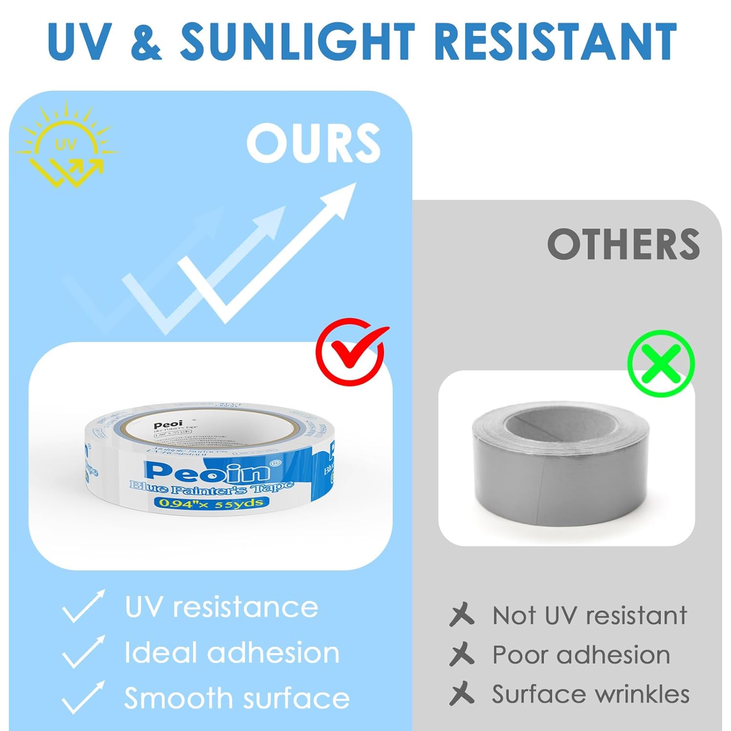 - UV Resistant: The blue painters tape 0.94 inch wide is made of high-quality crepe paper, preventing paint from seeping through and featuring UV resistance, moisture protection, and other characteristics, ensuring safety and efficiency. Perfect for all kinds of indoor and outdoor work. No need to worry about the tape getting wet
