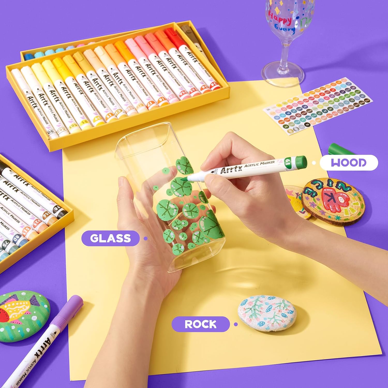 - Arrtx acrylic paint markers set: This marker set provides 48 Vibrant Colors shades for creativity. Please note: When you open the package for the first time, the order of placing the acrylic markers is the same as the order of the color card stickers, just stick them in order.