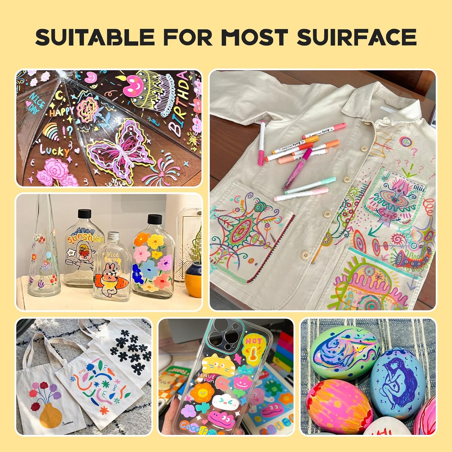- Suitable for Multiple Surfaces: Arrtx acrylic markers set provides water-based smooth ink and excellent coverage for a variety of surfaces, works for paper, cardstock, metal, rock painting, wood, plastic, canvas, fabric, stone, Easter eggs, easter decoration, metal, Christmas ornament, Halloween pumpkin painting, calligraphy, scrapbook, brush lettering, Christmas card, birthday gifts, greeting card, or any DIY crafts projects and more. Let's express imagination!
