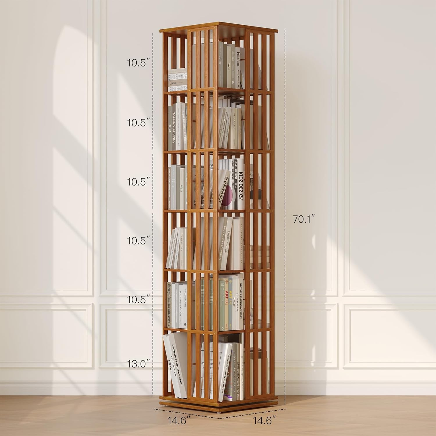 YOWOS Rotating Bookshelf Tower, 360 Display Spinning Bookcase, Bamboo Bookshelf Floor Standing Storage Rack, Wood Narrow Book Shelf Organizer for Kids&Adults, Walnut 6 Tier