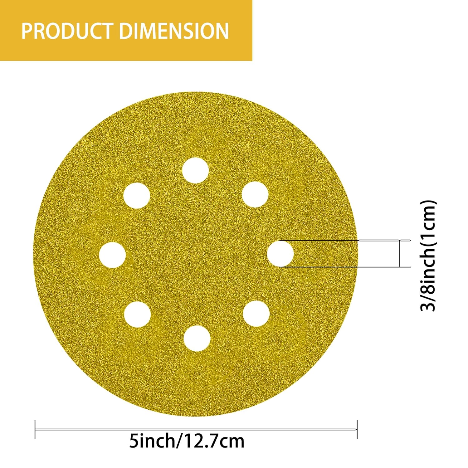 150PCS 80 Grit Gold Sanding Discs, 5-Inch 8-Hole Sandpaper for Random Orbital Sander,for Automotive or Woodworking