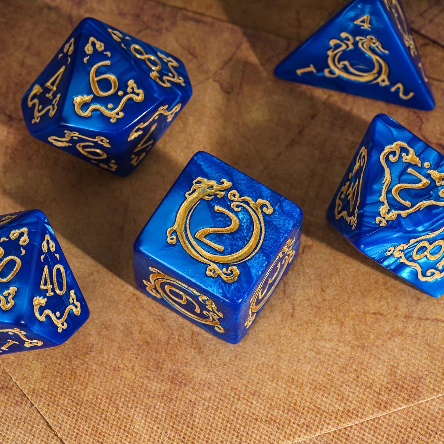 7-Die DND Dice Set Dragon Pattern Polyhedral Die with Leather Bag D&D Dice Set for RPG Table Games (Blue W/Gold Dragon Pattern)
