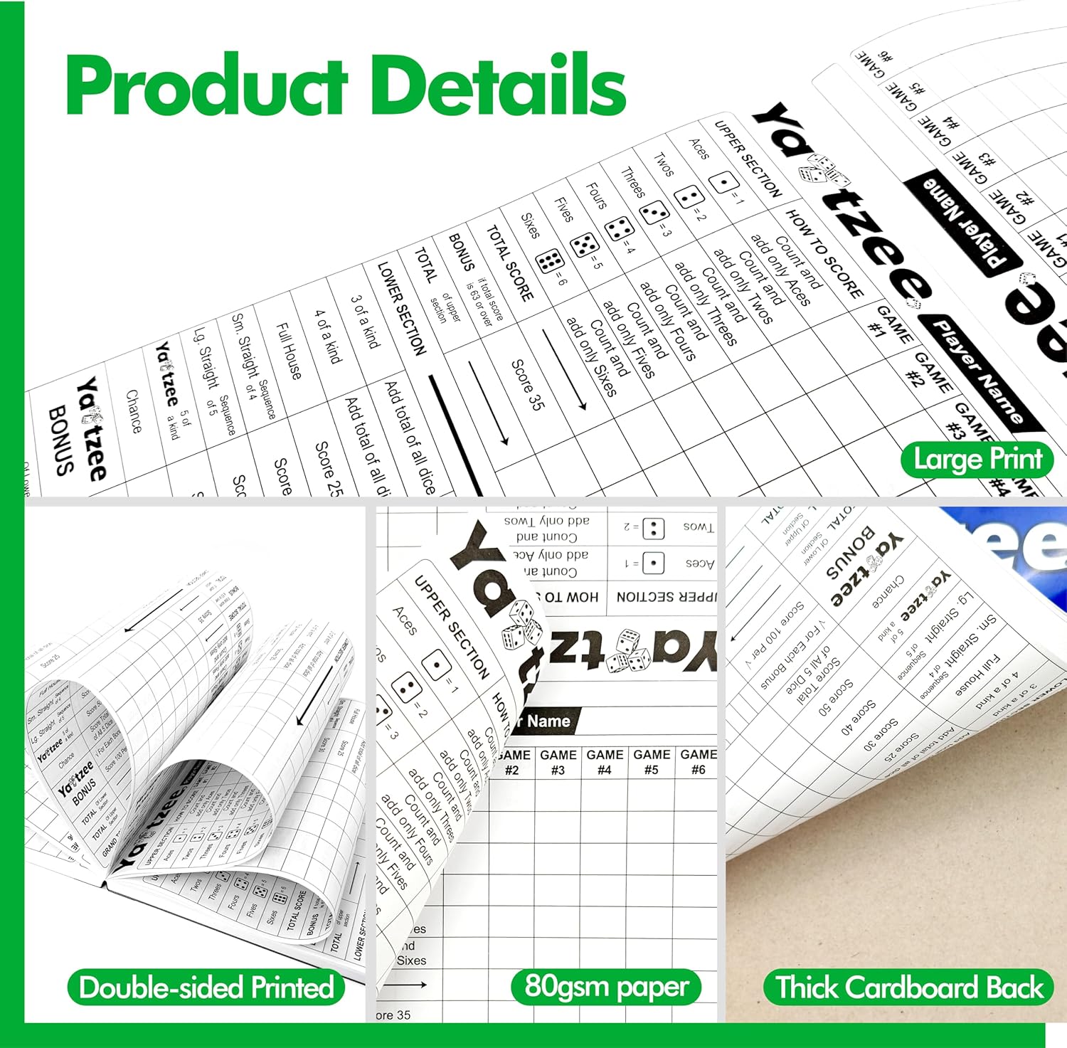 - Durable and Long-Lasting: Made of 80gsm paper and backed with a thickened back, this scorebook is design to withstand countless games for Yahtzee. It's a perfect addition to your game night collection and will provide years of reliable scorekeeping. The non-perforated design means no accidental rips, just smooth scoring all the way.
