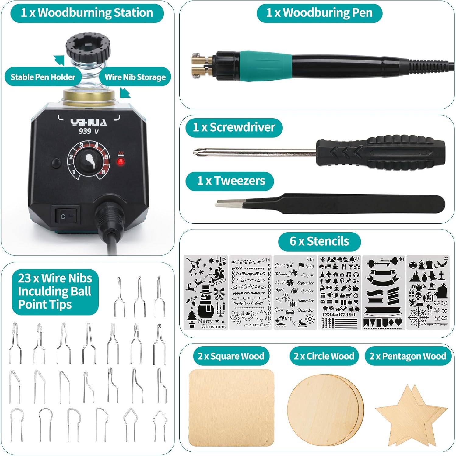 YIHUA 939-V Wood Burning Pen Wood Burning Kit with 23 Wire Nibs, Detachable Wood Burning Pen, 6 Wood Pieces, 6 Stencils, Tweezers Used as Wood Burning Tool
