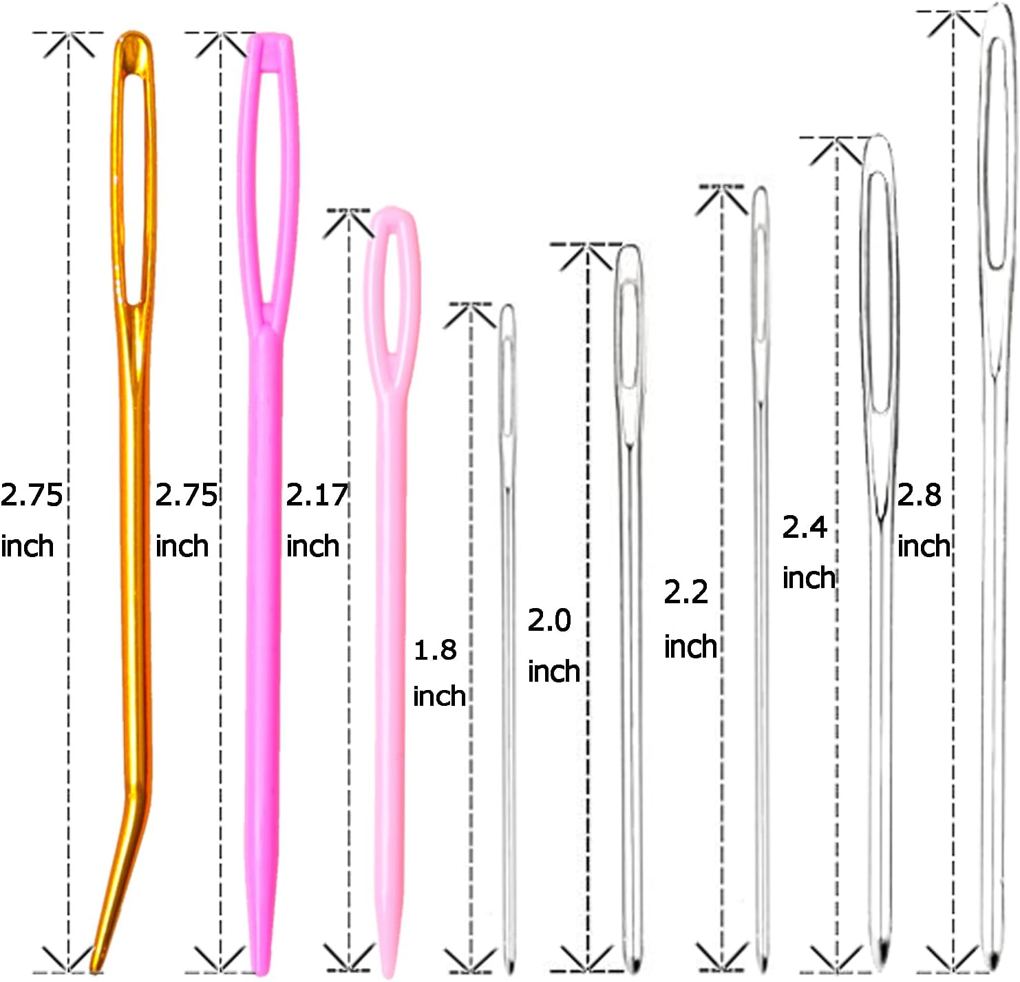 - DIFFERENT SIZES - 2.75in/70mm x 4 (Bent Tapestry Darning Needles), 2.17in/55mm x 2(plastic needles) ; 2.75in/70mm x 2 (plastic needles) ; 2 inch/52mm x 6(yarn needles), 2.4 inch/60mm x6(yarn needles), 2.8 inch/70mm x 6(yarn needles), 2.2 inch/56mm x 6(yarn needles), 1.8 inch/46mm x 6(yarn needles). It has different size needles, plastic and metal, and also is a handy kit to have on hand, great variety for beginners and experienced crafters.