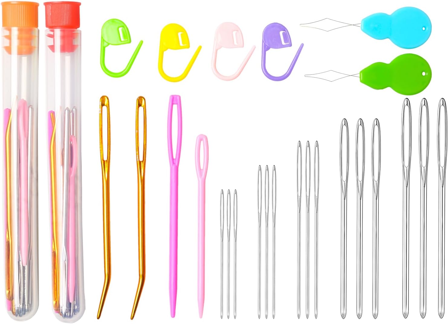 - Package Include - 30pcs large eye blunt needles, 4pcs bent yarn darning tapestry needle, 4pcs plastic sewing needle, 2 threaders & 5 sttitch markers, total 45pcs in two storage containers, differen kinds of sewing blunt needles to meet your daily needs and replacements. There are metal, plastic and bend ends for sewing, weaving in ends and darning any yarn project needed. The container makes it easier to keep track of your needles and will make finishing all of your projects a breeze.