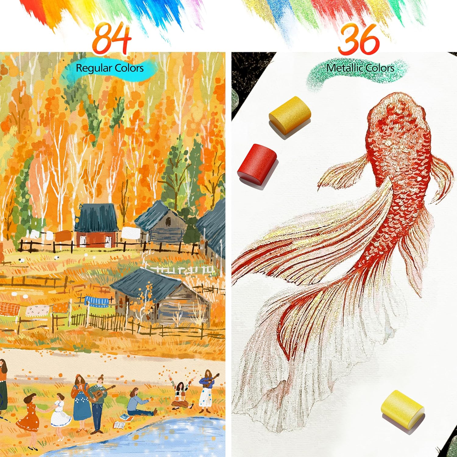 - 【113 PCS All in One Art Kit】The Premium watercolor set includes 50 regular colors, 35 metallic colors, 10 pastel colors, 5 fluorescent colors, 3 water brush pen, 6 detail paintbrushes, 1 art sponge, 1 swatch sheet, 1 HB pencil, 1 transparent palette, total 113 pcs!