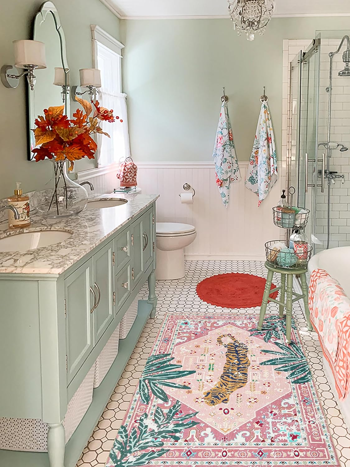 - -- WASHABLE BATHROOM RUGS -- This soft modern vintage area rug shall be machine washed in cold water. Use mild detergent. Do not bleach or dry clean. Do not use fabric softeners or dryer sheets. Do not wring.
