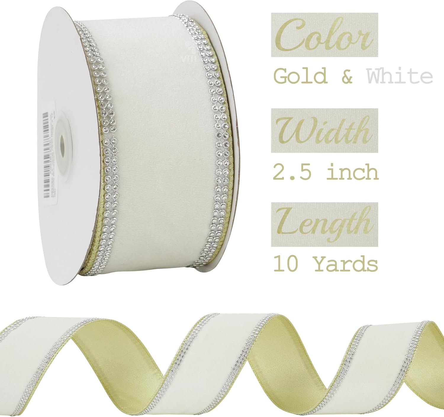 MEEDEE Gold & White Velvet with Rhinstone Edge Wired Ribbon 2.5 Inch Luxury Jeweled Ribbon 5 Yards Sparkling Rhinestone Trim for Christmas Tree, Garland, Wreaths, Holiday Home Decor, Wedding Decor