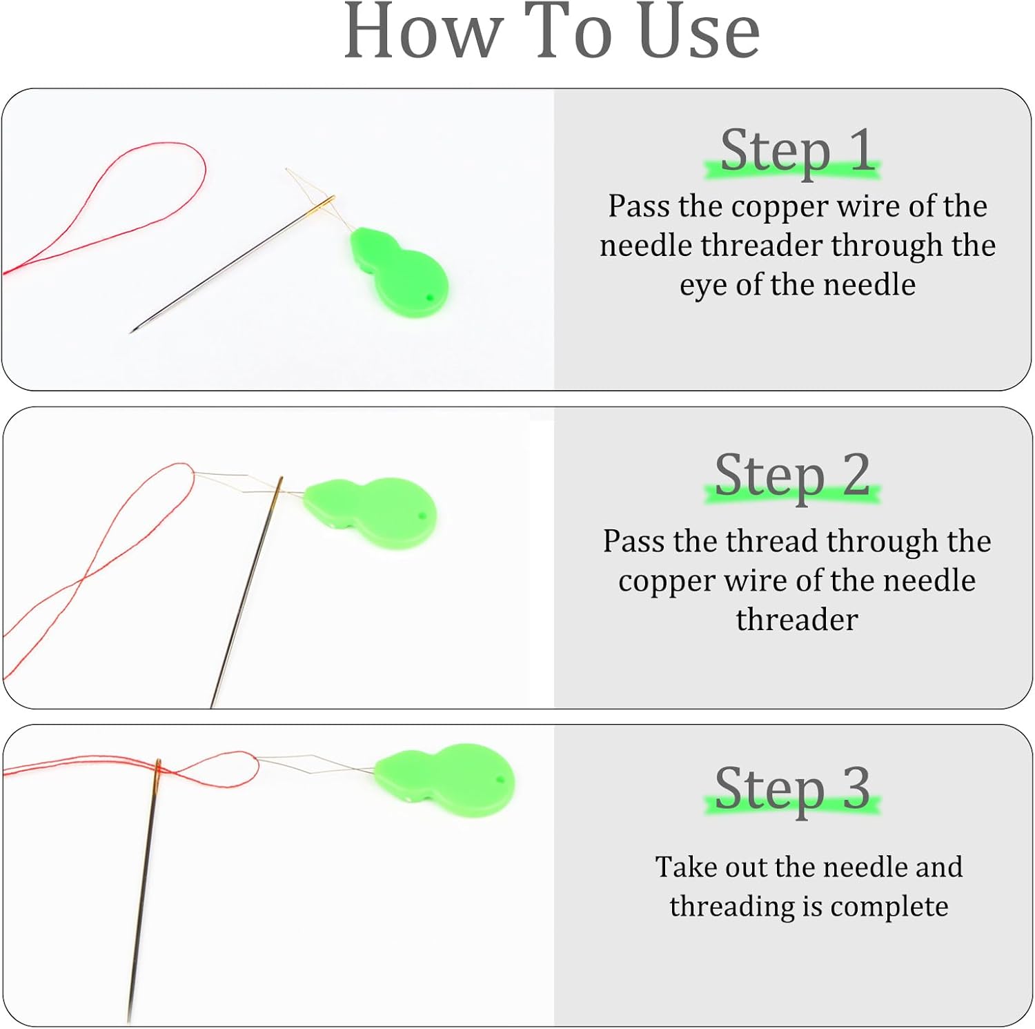 - Easy to Use: The first step: Put the steel wire of threader go through the eyehole of needle. The second step: Make the thread/string go into the steel wire of threader. The third step : Pull the steel wire away from the eyehole of needle.