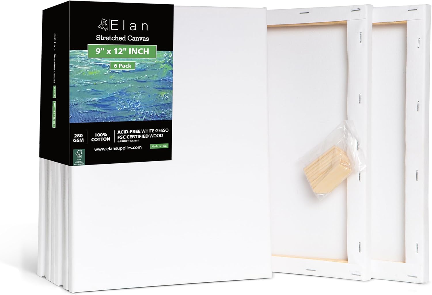 Elan Stretched Canvases 9x12 Inch, 6-Pack Blank Canvases for Painting 8 oz, Triple Primed Stretched Canvas for Painting, 9x12 Canvas Bulk