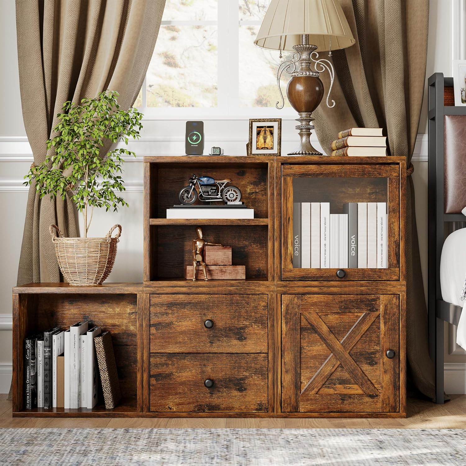 FUSUNBAO Magic DIY Cube Storage Organizer Stackable Cubes for Home Books Clothes Toy-Modular Cubby Storage System-Office Cubical-Bookcase Closet(Antique Brown, Glass Door Cube)