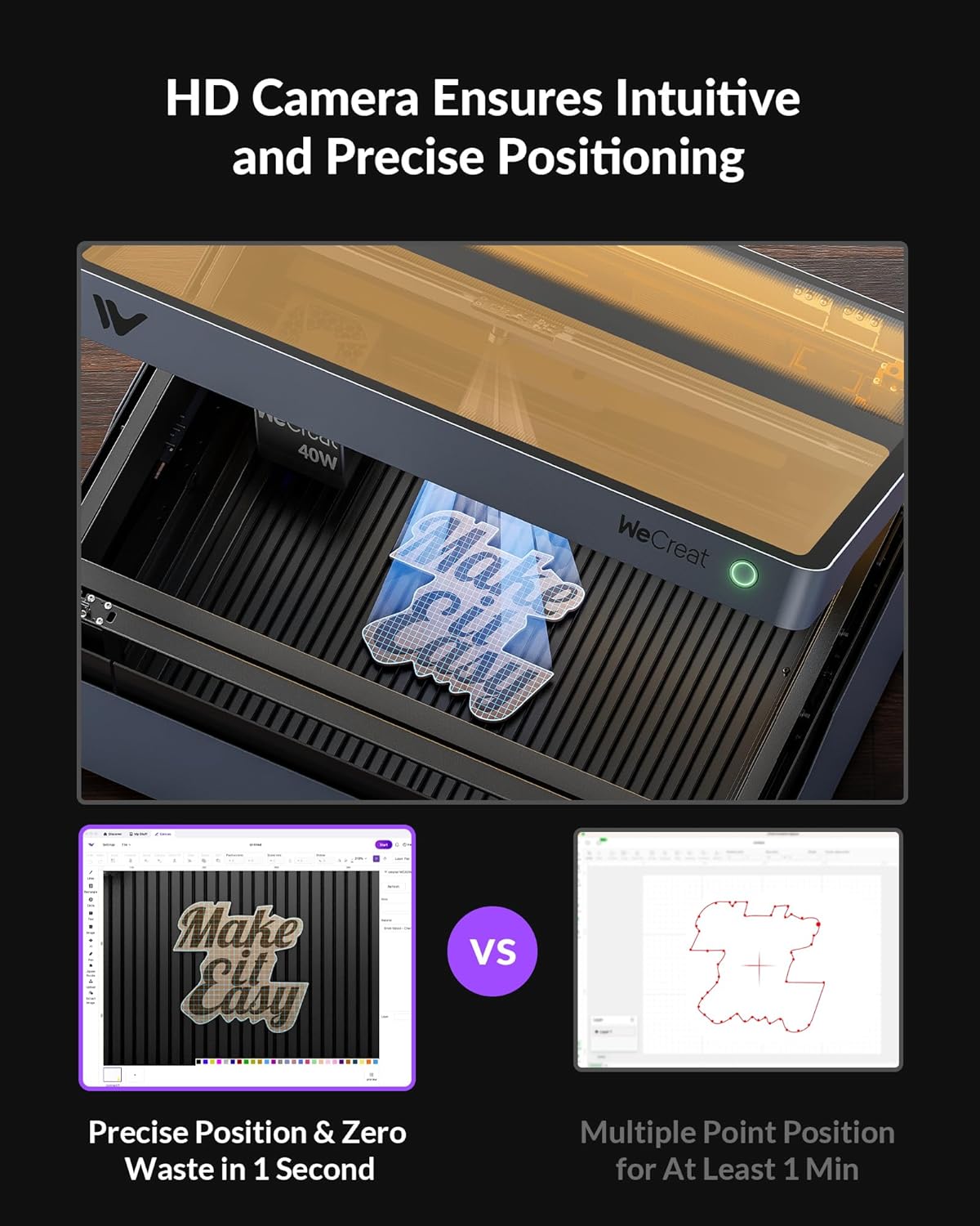 - Efficiency Camera Positioning: Built-in HD smart camera, auto-focus and precise position, achieving pinpoint accuracy with an error margin of less than 0.5mm, minimizing material waste. Compared with pin-point positioning, WeCreat camera positioning saves at 60% setup time. The 0.01mm movement accuracy enables precise engraving and cutting with flawless details, making Vision a perfect tool for woodworking and home business.