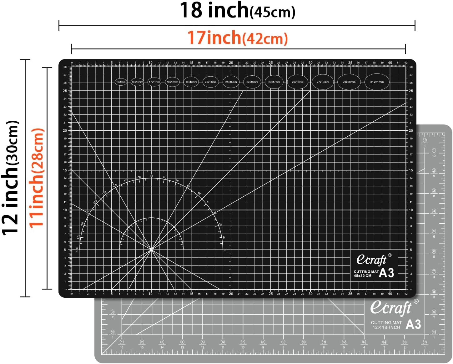 - ăRotary Mat SizeăAccurate cutting double sided, both inches and metric gridlines & angles.Mat size: 18 x 12inches(45 x 30cm), Grid size: 17 x 11inches(42 x 28cm),with easy-to-read measuring grids and 30, 45, and 60-degree bias lines that make angle cutting easy.