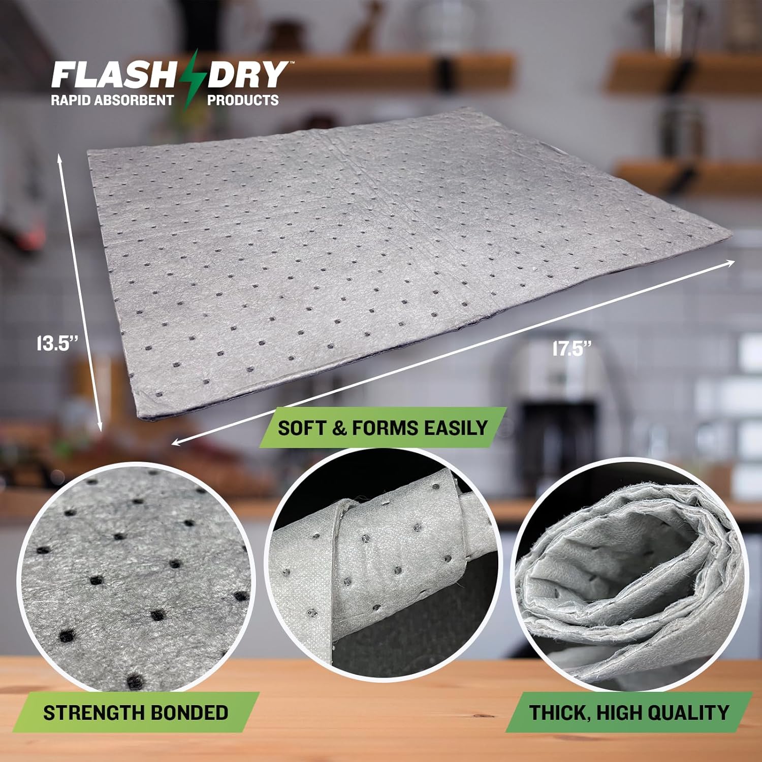- CONQUER ANY SPILL: Flashdry Universal Spill Absorbent Pads are versatile, dimpled and designed to tackle a wide range of industrial spills, leaks, and drips. With their exceptional absorbency, these pads effectively soak up common liquids such as oils, solvents, grease, paints, coolants, and chemicals making spills a thing of the past. Experience the convenience of quick and easy cleanups with Flashdry Universal Spill Absorbent Pads