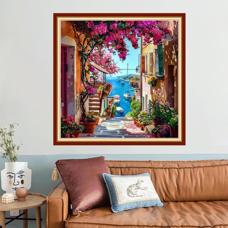 Joyhoor Stamped Cross Stitch Kits for Beginners, Needlepoint Kits for Adults, 11CT Counted Embroidery Kits-Seaside Flower Street 18x18 inchs