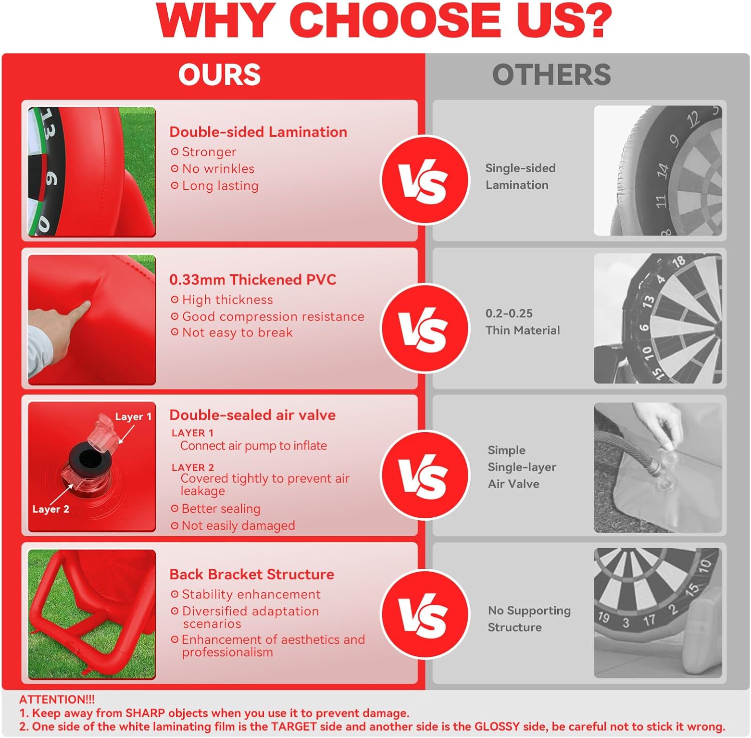 - Quick Installation and Convenient Storage: Inflatable dartboard is equipped with an electric air pump that inflates quickly, and it can be used separately after it finishes inflating and closing the valve. When in a fully deflated state, it can be easily folded and stored, making it easy to carry on long and short trips. The simple installation makes it easier and faster to join in the game