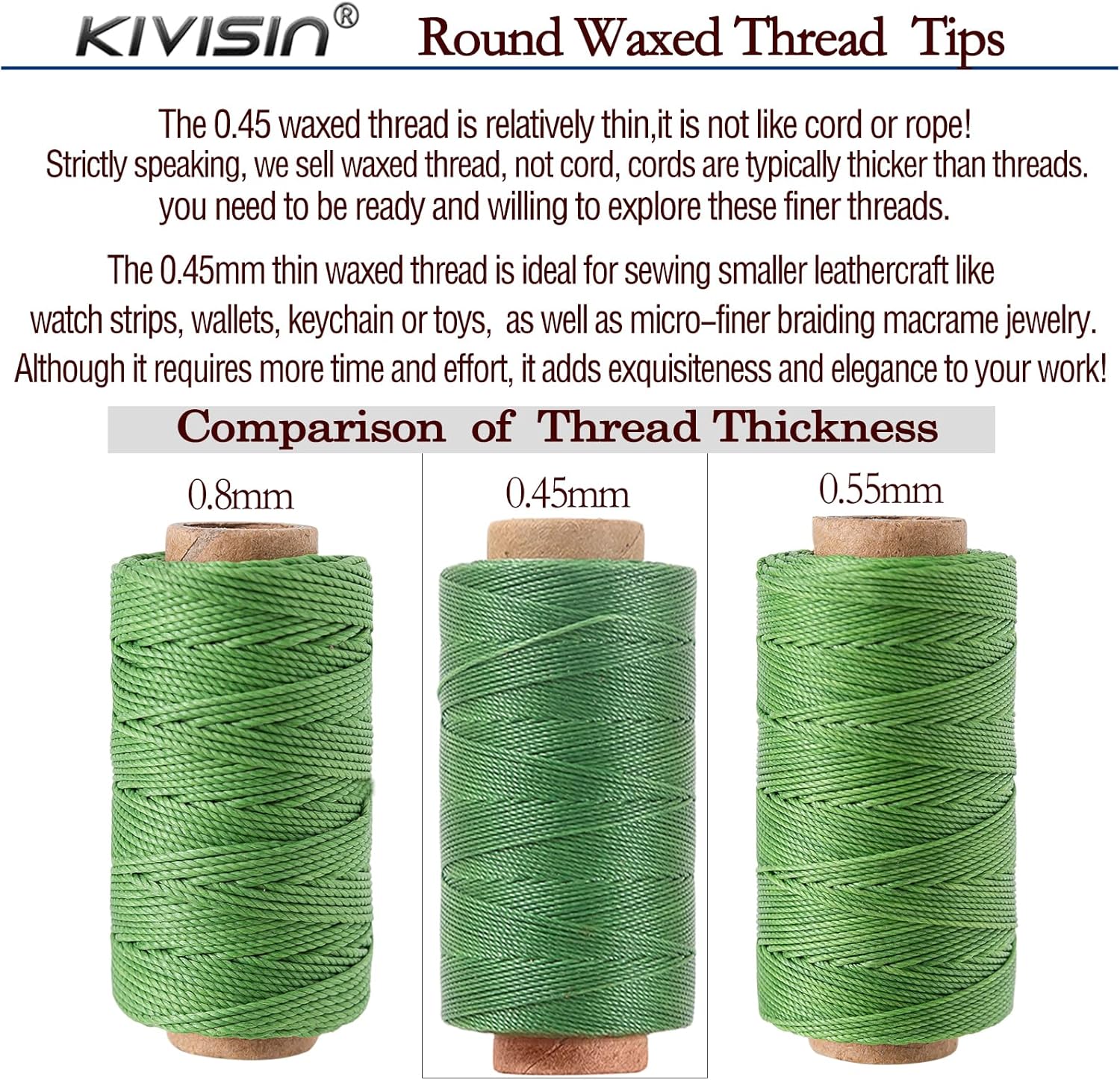 - The fine 0.45mm round wax polyester thread has a tiny diameter (0.017 inches) that creates a more delicate and refined appearance. It is suitable for leather sewing and stitching small leathercraft like wallets, watch straps, belts, toys, bookmarks, keychains and upholstery, as well as for book journall binding, beading, knotting and micro macrame jewelry making. The rainbow 12 colors also make your creations more vibrant and outstanding