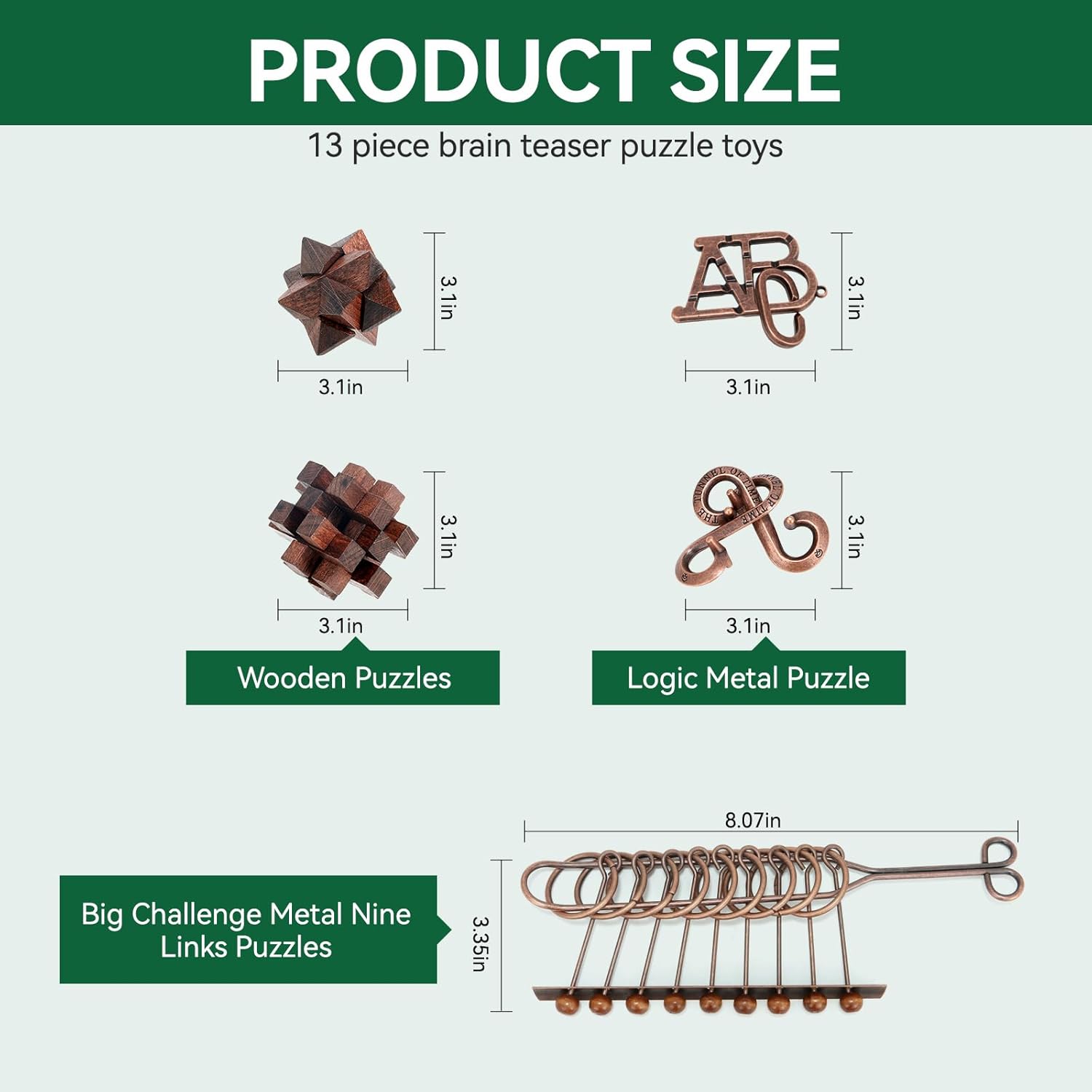 - 【Quality Material】The mind brain IQ logic puzzle are made of quality wood and stainless steel, safe and reliable, with smooth and rounded corners, which are not easy to break or bend.These puzzles are built to last, without peaked or cutting edges.This package comes with 13 pieces 3D brain teaser puzzles, each with their own distinct challenges and design.