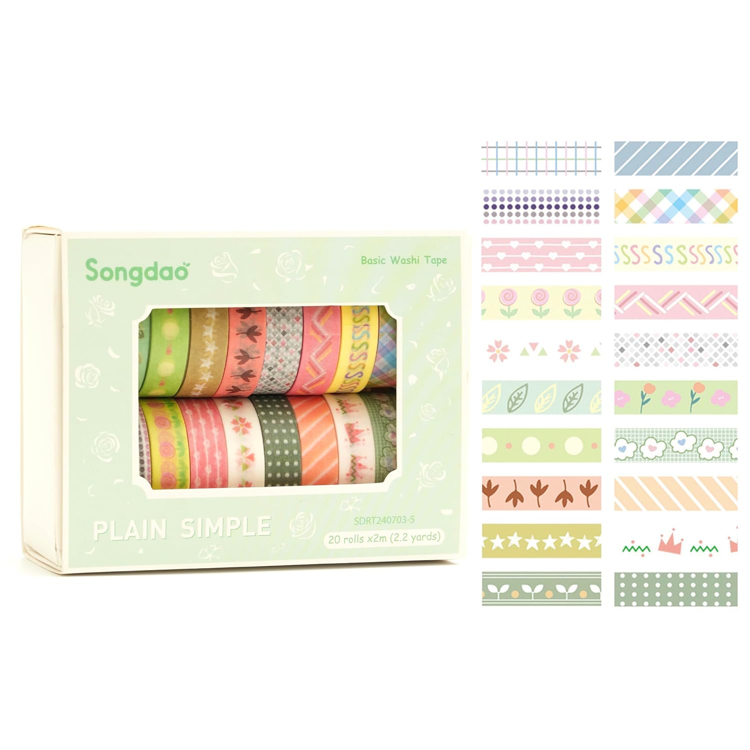 20 Rolls Basic Washi Tape Set Japanese Arts Adhesive Tapes Simple Patterns Decorative Masking Tape Sets for Craft, Kids, Scrapbook, DIY, Gift Wrapping (Style Five)